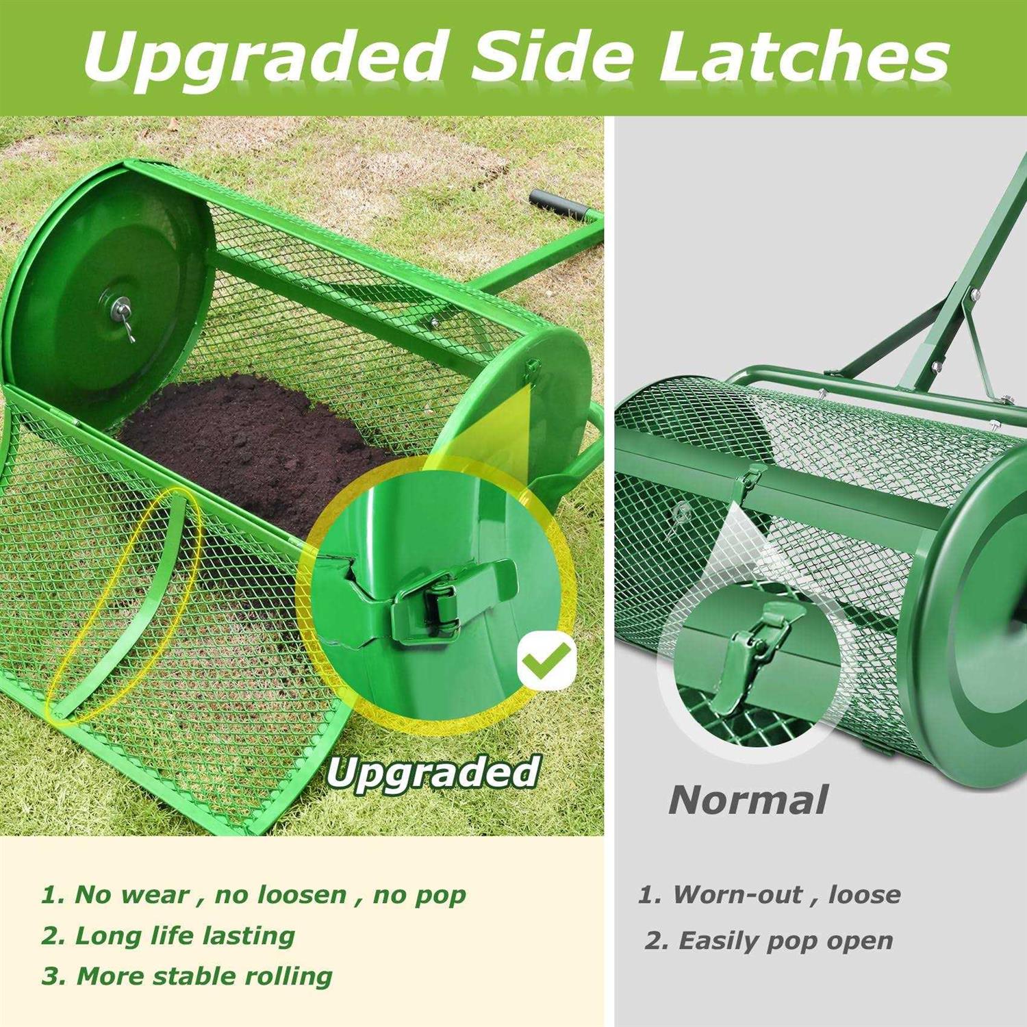 【Premium Material】The Seeutek compost spreader adopts a fully high-quality steel structure, which is sturdy and durable. The roller size is 15.8″ in diameter x 24″ in length, and the metal mesh surface is powder-coated and heat-treated, providing rust and corrosion resistance. Additionally, the ergonomically designed rubber T-shaped handle ensures a non-slip and comfortable grip. 【Upgraded Side latches&Support Rod】Seeutek manure spreader is easy to assemble and quick to disassemble. 14″ Hinged door opens and closes easily for easy filling. Side latches design, which is 6mm snap position and 2mm more than normal snap. The side latch and support rod ensure the roller stays closed during rolling. 【2.8ft³ Large Capacity with Shovel】With a 2.80 cubic foot capacity, topdressing is so efficient that you only need to go back and forth a few times. Spreading more efficiently and faster. It can spread a 1,000 square feet yard in 15 minutes. This prevents you from bending over for extended periods while working. The durable and versatile folding shovel can be used for tasks such as digging, shoveling, sawing, chopping, trenching, and more. It can be folded and stored in the included nylon bag. 【First ChoiceChoice for Beautifying Gardens Lawns】The Seeutek peat moss spreader crush clumps of material during rolling, enabling smooth operation on slopes and uneven terrains. Its 0.4″*0.8″ dense diamond mesh ensures even spreading of compost, peat moss, fertilizers, topsoil, mulch, and other coverings for plants and flowers in lawns, gardens, and backyards. Moreover, it provides essential nutrients for the vegetation, enhancing its growth and beauty.