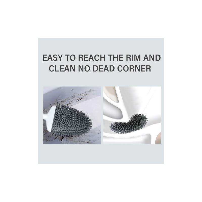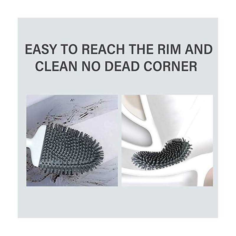 The flat brush head can be bent to fit the angle of the rim perfectly, reaching under the rim. The tip of the brush head is designed to clean the edge of the toilet bowl better by bending the brush head upward.