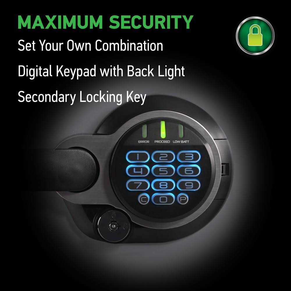 - Battery-powered digital locking system uses a programmable 1-8 digit code.