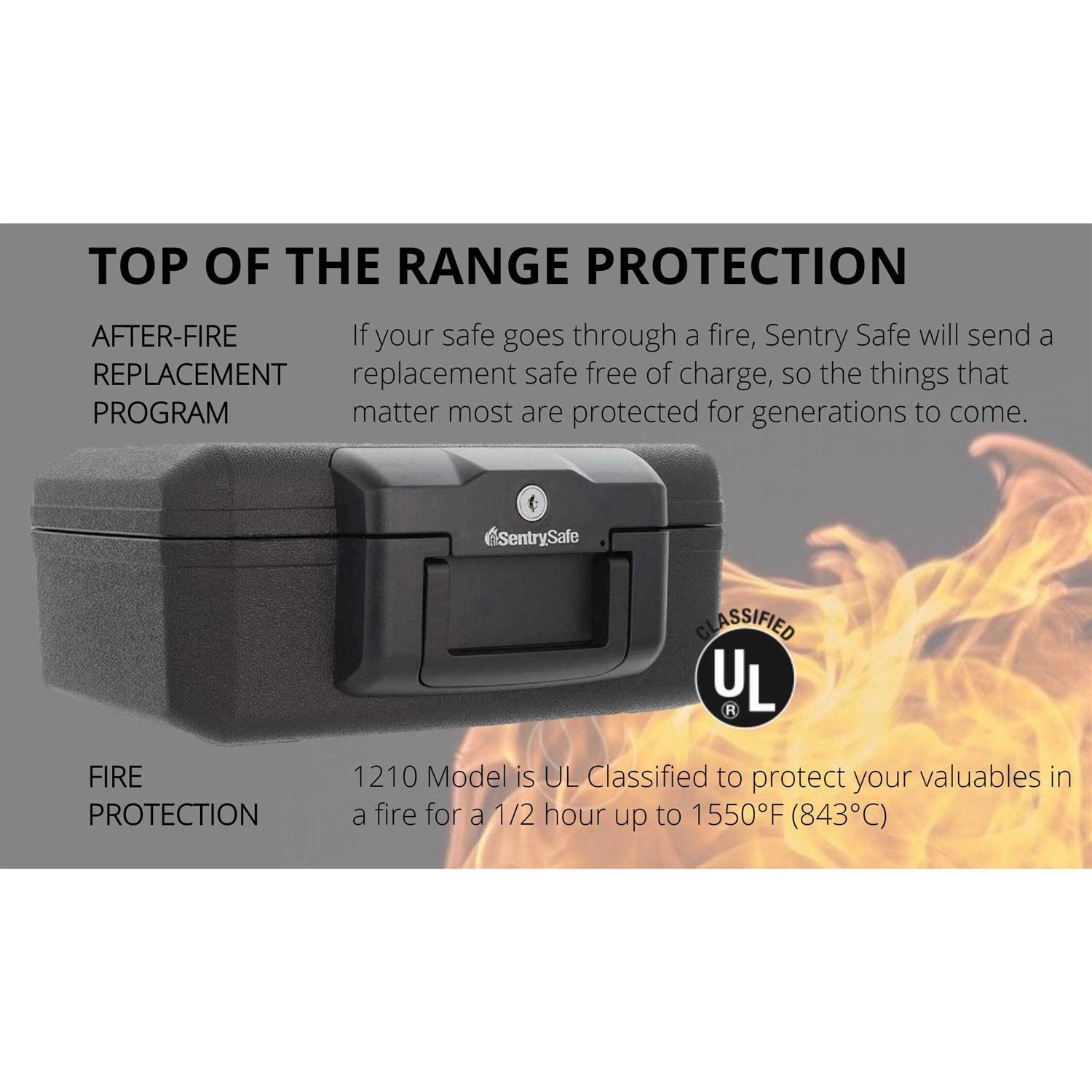 The Sentry 1210 fire resistant documents chest is tested by U.L to temperatures of up to 843°C for 30 minutes. The Sentry 1210 will protect your documents from fire and also offers you a Sentry lifetime after-fire replacement guarantee.