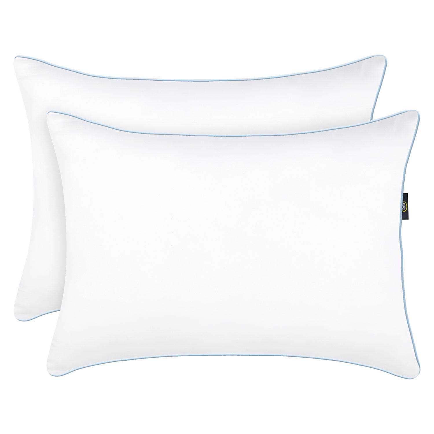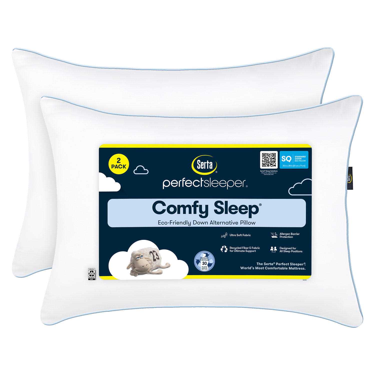 The pillow has an ultra-soft, breathable 300-thread count 100% microfiber cover with a light blue satin cording and filled with hypoallergenic, sustainably sourced SupraLoft recycled polyester fiber fill. Due to the specific weave of the fabric, this pillow has an allergen barrier. Both the cover and fiber fill are made using recycled plastic that is equivalent to 30 plastic bottles. The Serta Perfect Sleeper Comfy Sleep Eco-Friendly bed pillows machine washable for ease of care. The standard/queen pillow is 20 x 28 to fit in any standard or queen-sized pillowcase.