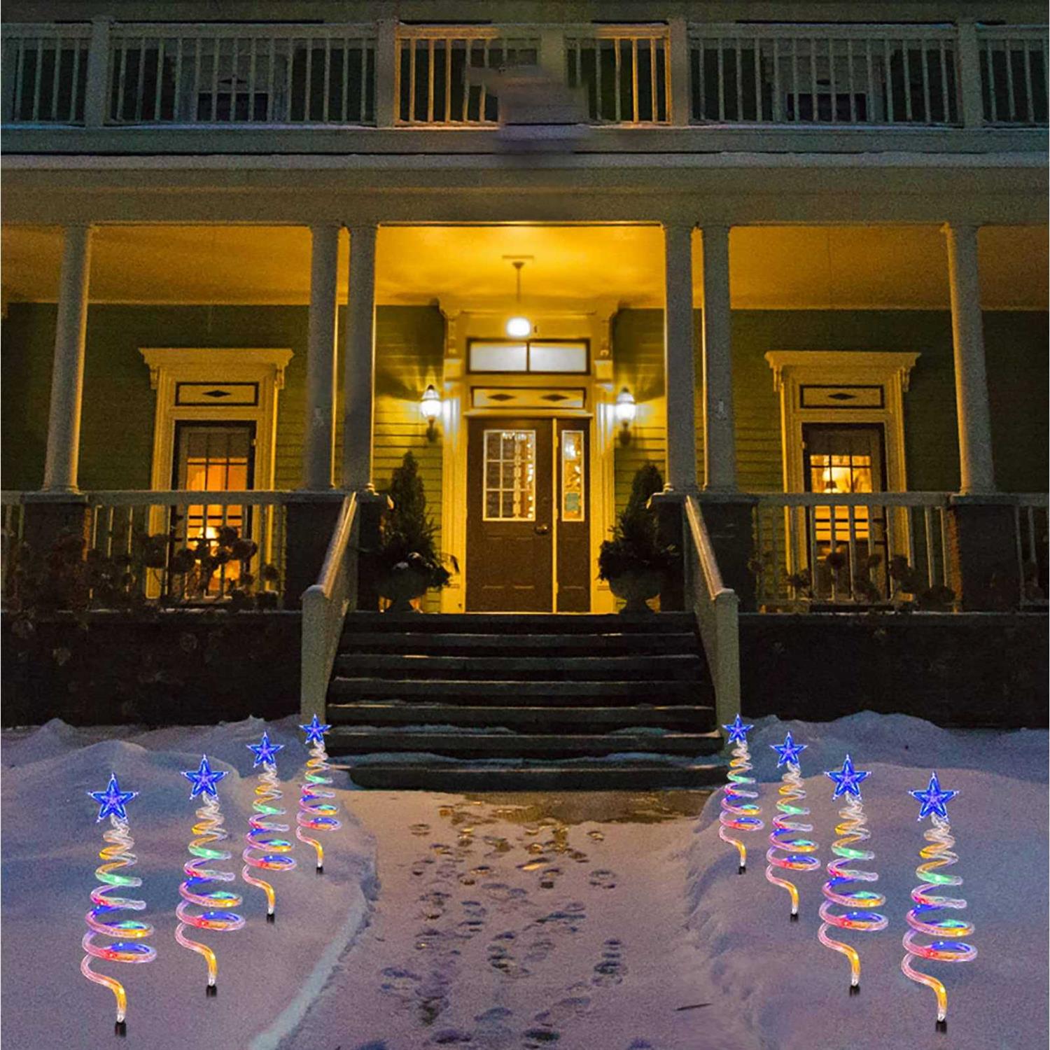 Each spiral tree illuminated by 10 multi color LEDs which exudes holiday cheer in this Christmas. High quality nylon and iron wire material make this lights for long-lasting enjoyment. Twinkle and Steady Modes: Christmas pathway lights feature 2 lighting modes, including steady on and twinkle effects. It makes your garden more glamorous and brings a fantastic viewing in day and night showing on both sides of walkway. Enjoy the twisting spiral effect design with charming glow effect. Easy Installation: Total 11.5 ft Christmas pathway lights set features 4 stakes, each spiral tree separated by 20 inch range. A quick and easy assembly includes lawn stakes with tangle free transparent PVC cord. Simply set them up outside during the holiday season for a festive walkway. Solar Powered: Christmas pathway lights are fully solar powered, which are equipped with high-quality adjustable solar panel and an all-round dimming angle for sunlight. Illuminate the front yard or walkway for the holiday season and weather resistant designed for year-round use in an eco-friendly way. Beautiful Decoration: This spiral cone tree lights are the perfect for any area of your yard that needs a special holiday touch. Each spiral tree illuminated by 10 multi color LEDs. Christmas pathway lights feature 2 lighting modes, including steady on and twinkle effects. Total 11.5 ft Christmas pathway lights set features 4 stakes, each spiral tree separated by 20 inch range.