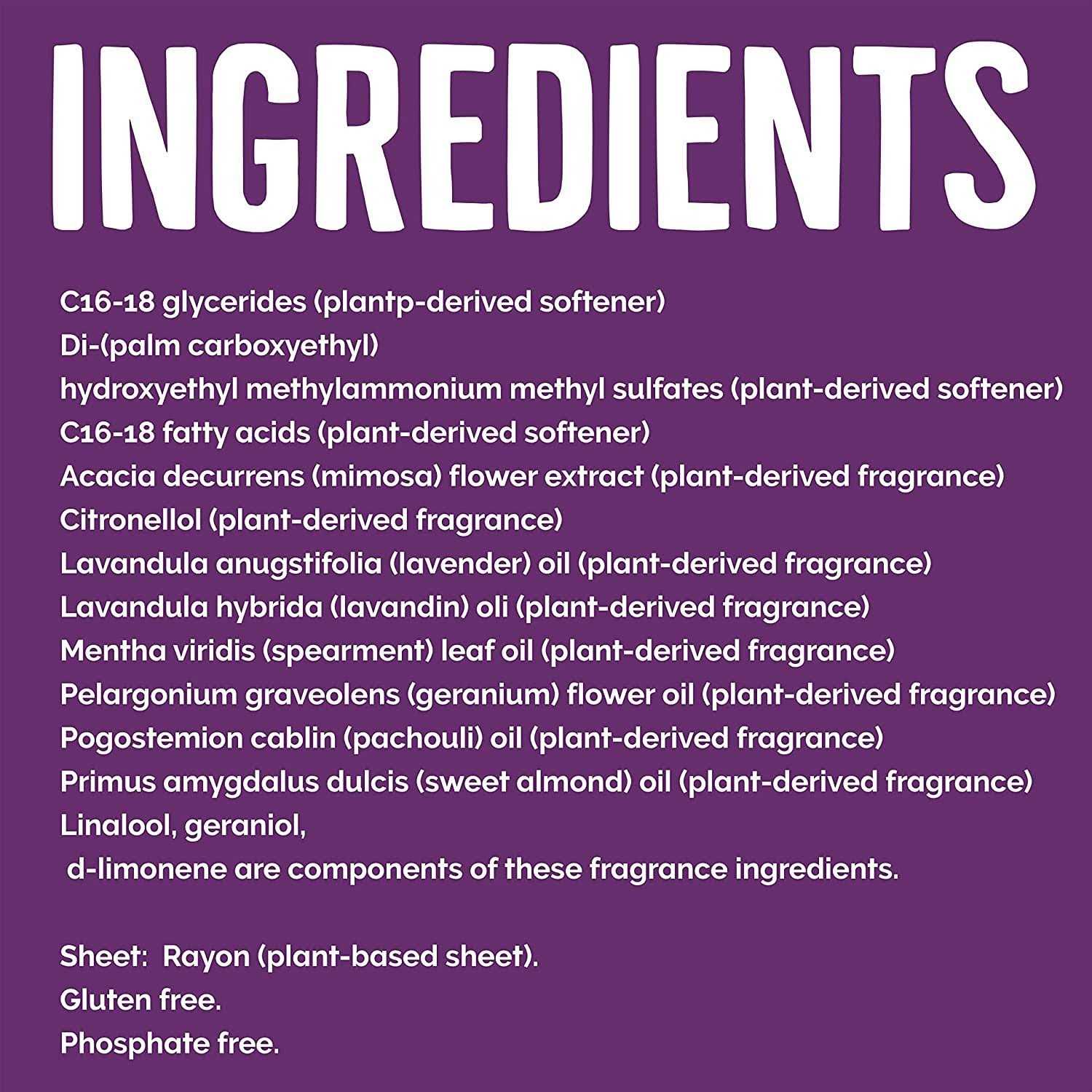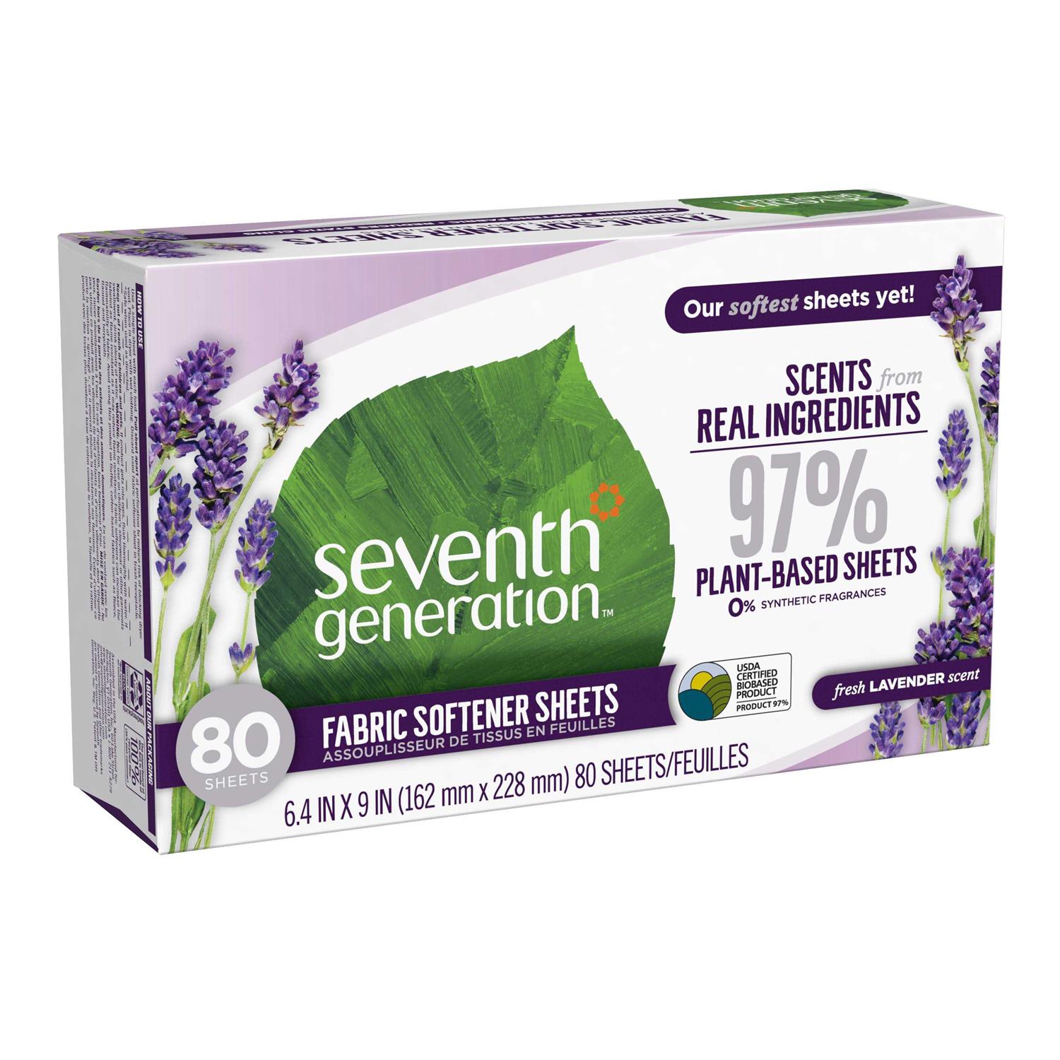 Seventh Generation’s Lavender Fabric Softener Sheets are your laundry’s new best friend. With 97% plant-based ingredients, they’re committed to caring for your family and the planet. No secrets here – they proudly list all ingredients on the package. Infused with the refreshing scents of eucalyptus and lavender from essential oils and botanicals, these fabric softener sheets give your clothes a natural and delightful fragrance without overwhelming your senses. Experience the power of softness and less static, all in a simple sheet. Just toss one in with your laundry and enjoy the soothing scent and gentle softness every time you pull your clothes out of the dryer.Ingredients: C16-18 glycerides (plant-derived softener), Di-(palm carboxyethyl) hydroxyethyl methylammonium methyl sulfates (plant-derived softener), C16-18 fatty acids (plant-derived softener), Acacia decurrens (mimosa) flower extract (plant-derived fragrance), Citronellol (plant-derived fragrance), Lavandula anugstifolia (lavender) oil (plant-derived fragrance), Lavandula hybrida (lavandin) oli (plant-derived fragrance), Mentha viridis (spearment) leaf oil (plant-derived fragrance), Pelargonium graveolens (geranium) flower oil (plant-derived fragrance), Pogostemion cablin (pachouli) oil (plant-derived fragrance), Primus amygdalus dulcis (sweet almond) oil (plant-derived fragrance). Linalool, geraniol, and d-limonene are components of these fragrance ingredients. Sheet: Rayon (plant-based sheet). Gluten-free. Phosphate free.