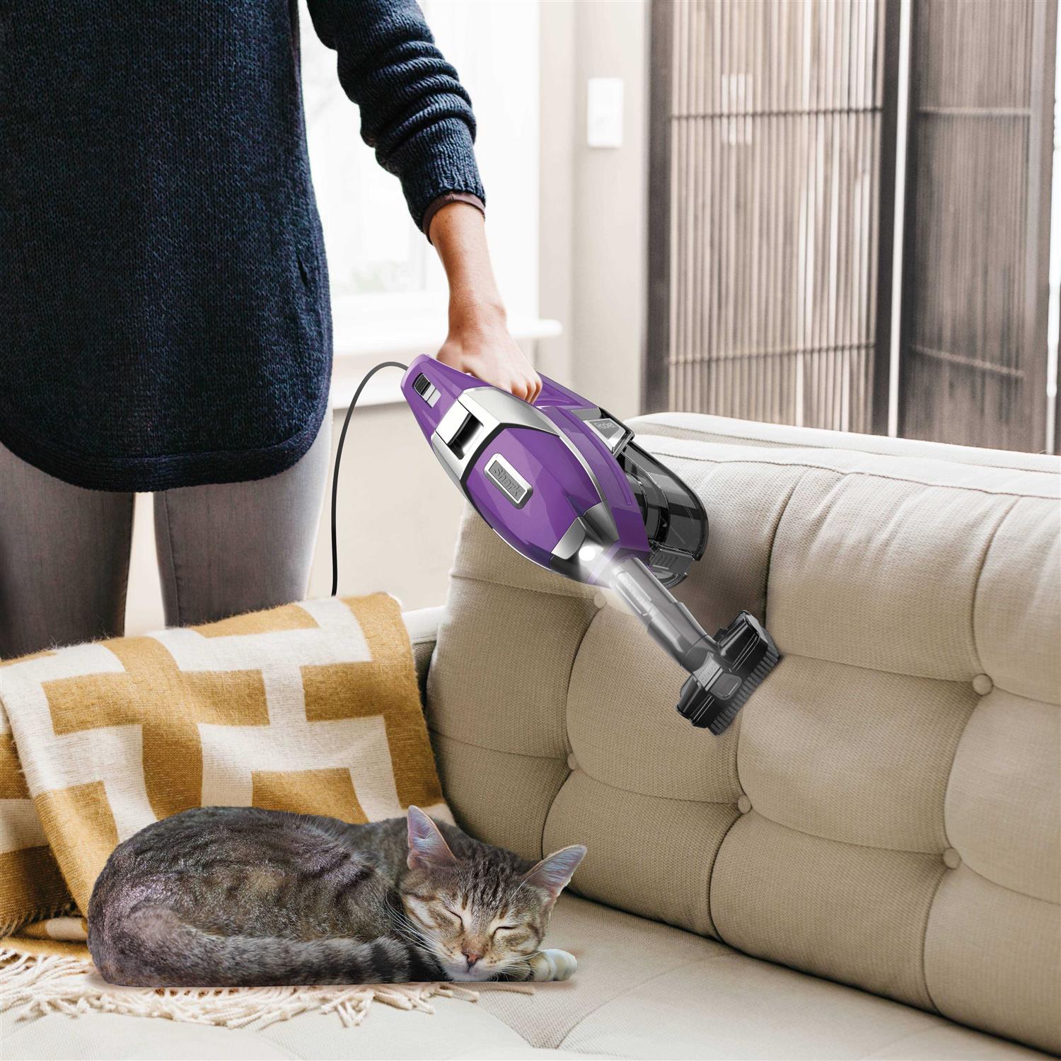With Zero-M, this ultra-lightweight stick vacuum cleaner features powerful Shark suction and outstanding cleaning performance while delivering nonstop hair removal with a self-cleaning brushroll. The Shark Rocket Zero-M cleans hard floors and deep-cleans carpets, and easily converts to a handheld vacuum for versatile floor-to-ceiling cleaning. Features include a removable XL-capacity dust cup, and Advanced Swivel Steering. Converts to a handheld vacuum to easily clean stairs, furniture, and other above-floor surfaces. Its slim design is perfect for reaching high up and in between narrow spaces using the quick-release foot pedal to separate the floor nozzle. Easily spot hidden dirt with bright LED lights located on the nozzle. MultiFLEX Technology folds over for compact, free-standing storage and provides flexible reach to get under beds, couches, and tables. Weighing under 10 pounds, this lightweight vacuum has a removable dust cup for easy emptying and a brush roll garage for quick and easy access from the top of the vacuum. With a generous, 30-foot power cord, it never loses power.