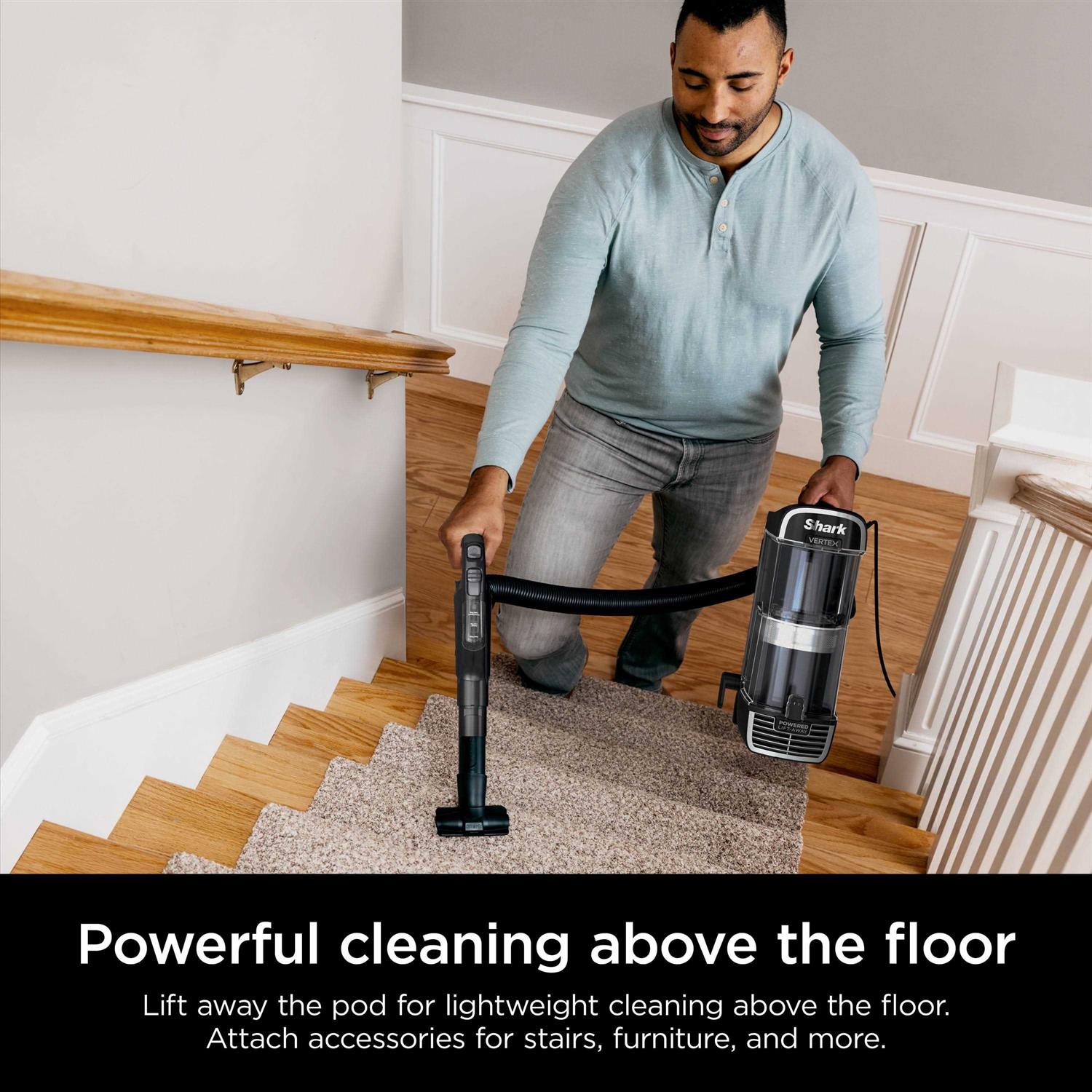 The Shark Vertex Speed with Powered Lift-Away is an ultra-powerful upright vacuum, with incredible suction for cleaning on both hard floors and carpets. This upright vacuum is loaded with Sharks most innovative cleaning technologies, like DuoClean PowerFins. While the soft front roller pulls in particles, PowerFins deliver continuous cleaning contact to dig deep into carpets, directly engage floors, and pick up more in every pass (vs. original DuoClean). Powered Lift-Away lets you detach the pod to clean under furniture with the motorized nozzle, or remove the nozzle with the push of a button to clean above-floor areas. Anti-Allergen Complete Seal Technology and a HEPA filter trap 99.9% of dust and allergens inside the vacuum, keeping them out of the air you breathe. (Based on ASTM F1977 of particles .3 microns or larger.) The self-cleaning brushroll gives the Vertex Speed powerful pet hair pickup with no hair wrap. Powerful LED headlights on the nozzle reveal hidden debris around your home to ensure you dont miss a mess. Active Glide technology means the Vertex Speed has smooth maneuverability on hard floors and carpets while maintaining powerful suction. Attach the cleaning accessories to help tackle stubborn pet hair and hard-to-reach spaces. The Shark Vertex Speed with Powered Lift-Away has the power and innovation to take your cleaning to the next level.