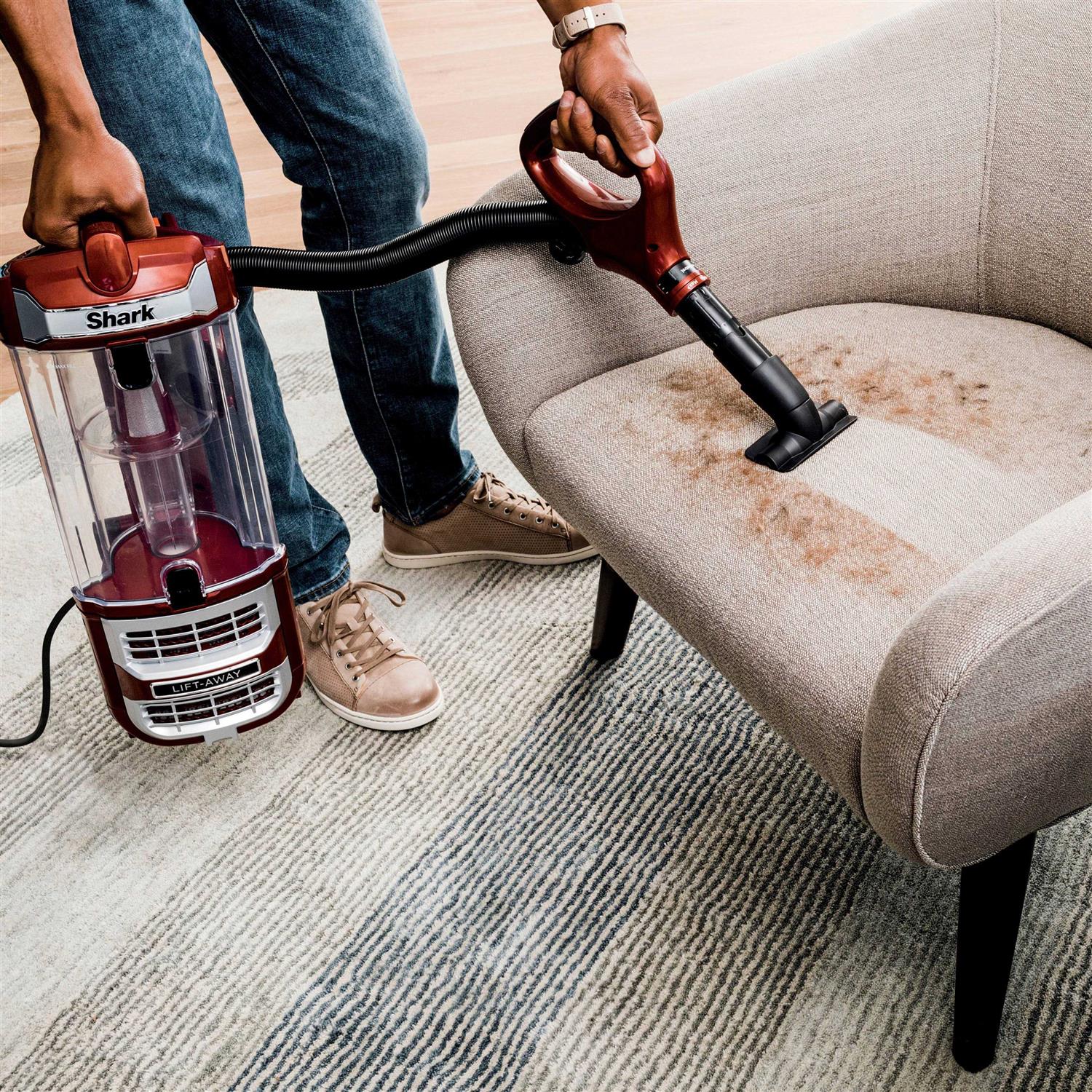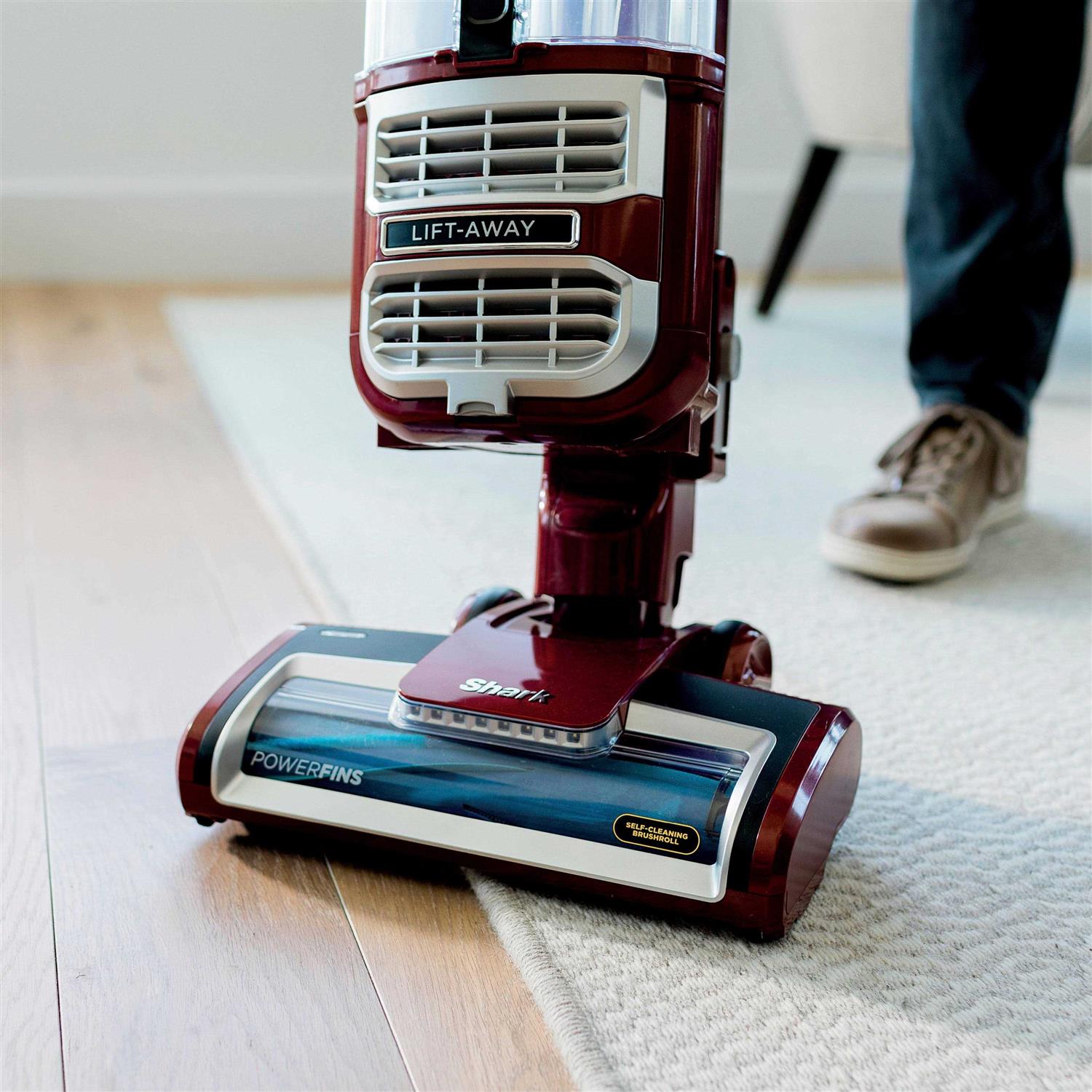 This lightweight Lift-Away upright vacuum has a PowerFins nozzle, engineered to pick up more hair with no hair wrap (versus Shark bristle brushrolls). Lift away the pod to easily clean stairs, furniture, and more. Anti-Allergen Complete Seal traps dust and allergens inside the vacuum. LED headlights illuminate hidden debris, while Swivel Steering makes it easy to maneuver around furniture.