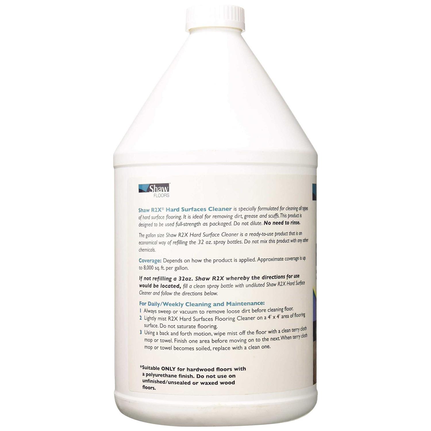 Shaw R2x Hard Surfaces Cleaner is specially formulated for cleaning all types of hard surface flooring. It is ideal for removing dirt grease and scuffs. This product is designed to be used full-strength as packaged. Do not dilute. No Rinsing Required. Shaw R2x Hard Surfaces Floor Cleaner Gallon is best used when poured into a spray bottle and applied with a mist/spray. Shaw R2x Hard Surface Floor Cleaner brightens and preserves finishes leaves no sticky or dulling residue. Safe for all types of Ceramic Hardwood (polyurethane) Laminate and Vinyl flooring.