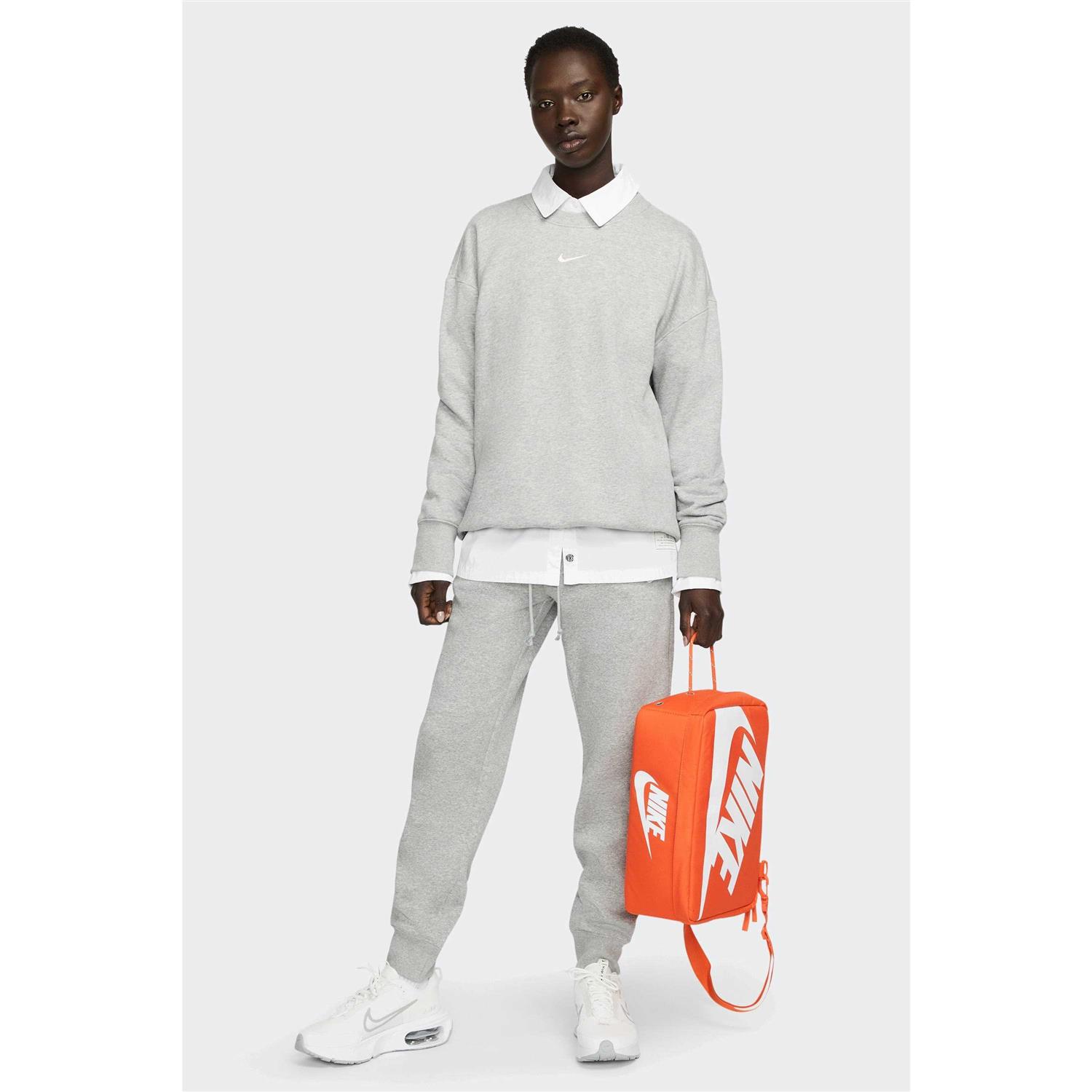 Store and carry your shoes in style with the Nike Shoe Box Bag. Made with durable materials the main body features 2 large Nike logos a removable crossbody strap and a true shoebox flap opening. On the inside an internal elastic pocket and zippered mesh pocket help keep extra laces and other small items stored and organized.