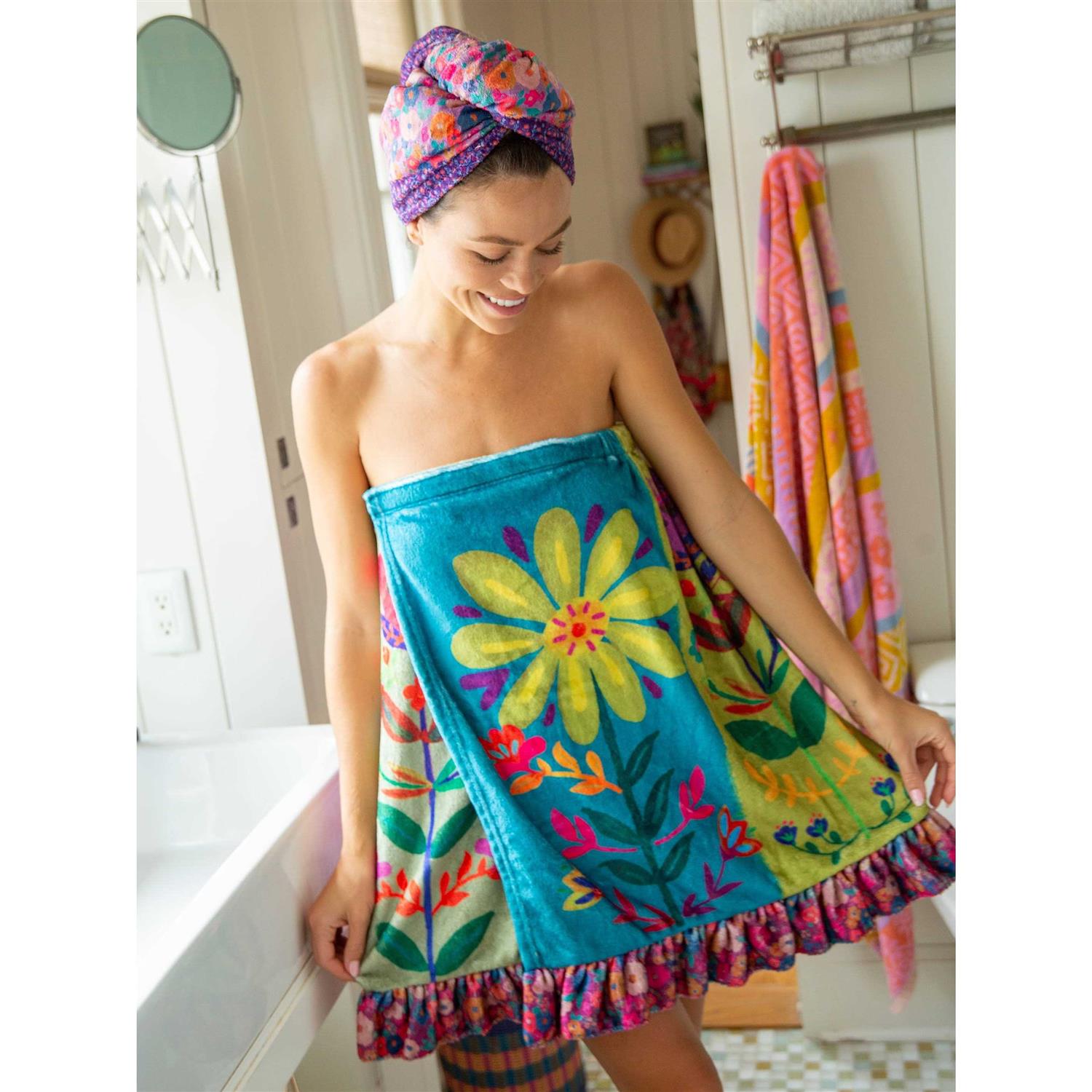 Don’t you hate it when you wrap a towel around you after the shower and it never stays? Now you can blow dry your hair or apply your makeup without having to worry! Finish the rest of your getting-ready routine in confidence. It’s printed with colorful giant flowers and is finished with a little ruffle detail.