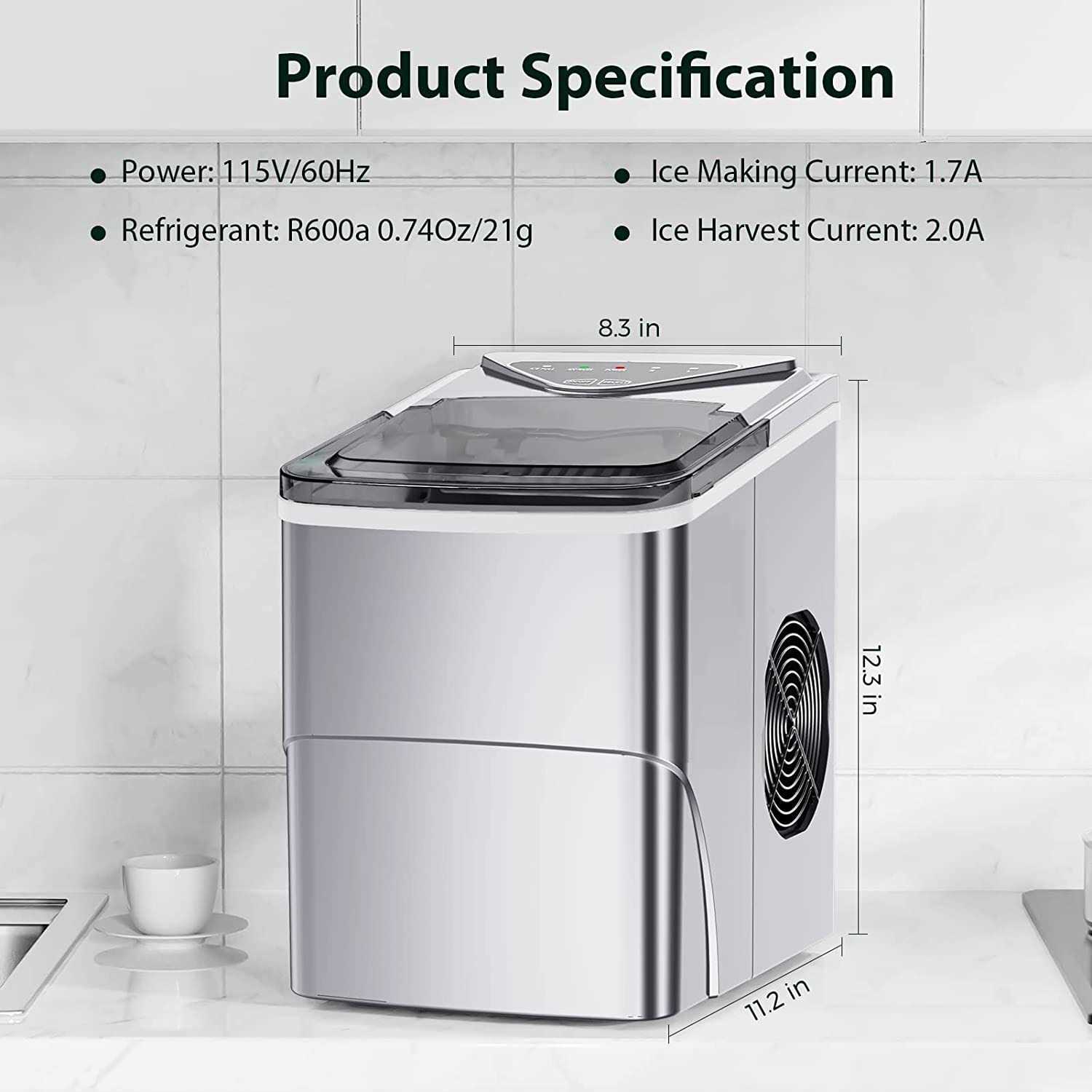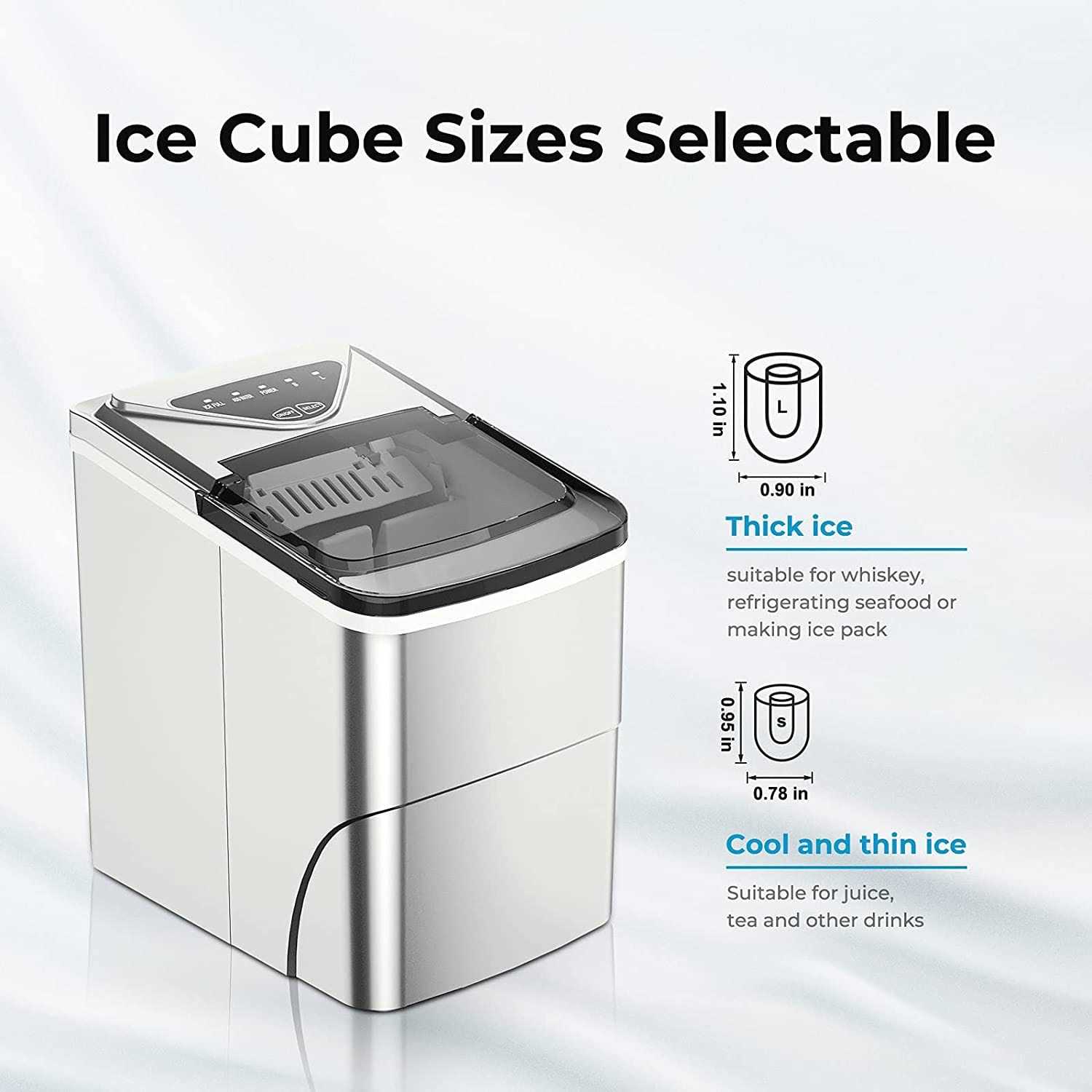 Note : Please check the dimension and item weight of the product and confirm it fits your space FAST ICE MAKER: The Silonn ice maker only takes 6 minutes to make 9 bullet-shaped ice cubes. Fill 2L of water into the water tank, maximum ice capacity can reach 26 pounds in 24 hours. TWO SIZES OF ICE CUBES: You can make two different sizes of ice cubes. Small ice cubes can chill seafood and beer keeping it fresh and cold. Large ice cubes are more suitable for beverages to achieve a rapid cooling effect. QUIET AND USER FRIENDLY: When making ice cubes, the noise is lower than 35dB, similar to a working refrigerator. The transparent lid allows you to monitor the ice capacity. The sensor automatically detects when ice is full and stops producing to prevent overflowing. EASY TO CONTROL: The control panel is very easy to operate. Fill the ice maker with water, press the ON button, select the size of the ice cubes and that’s it. When the water is insufficient or the ice basket is full, the indicator light will turn on. SELF-CLEANING & PORTABLE: Silonn ice Maker machine is portable and efficient with size of 12.3 x 8.7 x 12.5 inches. Press the ON/OFF button for 5 seconds to start the self-cleaning process.
