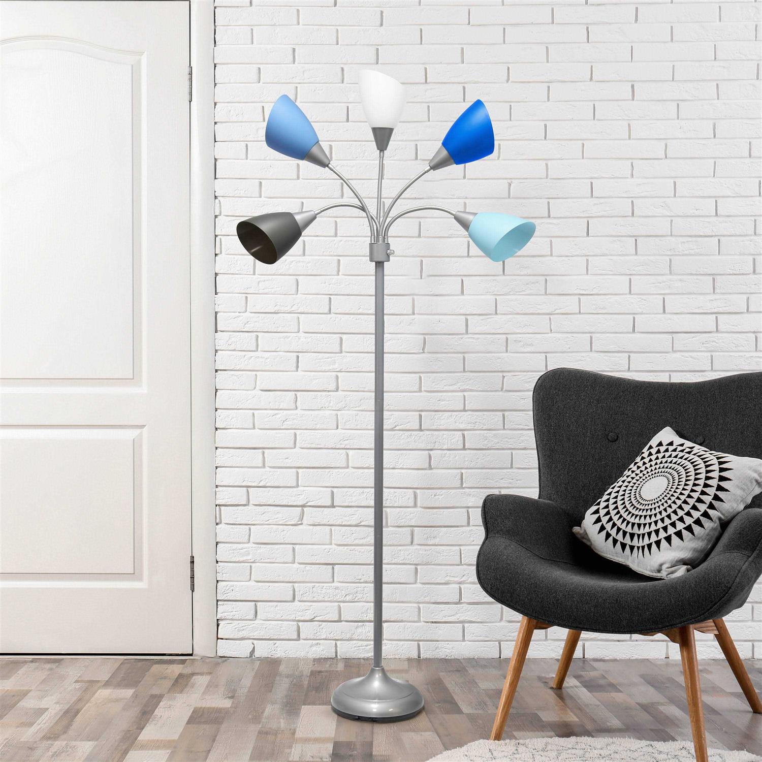 Brighten up a playroom or recreation space with the adjustable gooseneck arms of this modern five-light floor lamp. From All the Rages, it boasts a classic stance paired with an updated silver finish. Its five plastic lamp shades boast hues of blue, gray, and white to create a stylish finishing touch.