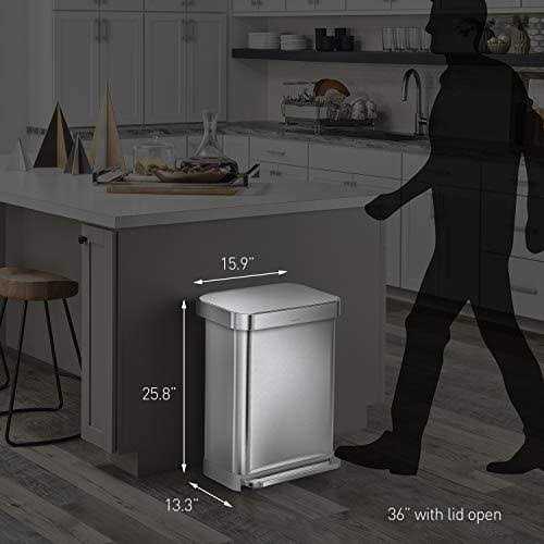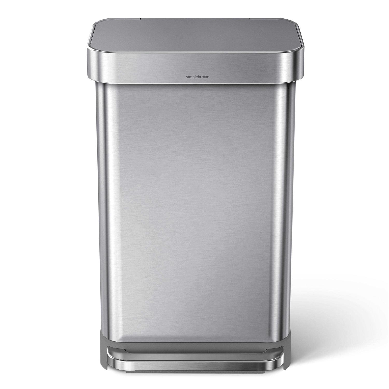 The simplehuman 45 liter brushed stainless steel rectangular step trash can features an innovative ‘liner pocket’ that stores and dispenses liners from inside the garbage can for a faster liner change. The stainless steel liner rim grips the liner and keeps it hidden. And with no inner bucket, there’s more space for trash. Strong plastic pedal is designed to last, and patented lid shox technology ensures a smooth, silent close of the dent-proof plastic lid every time. Code M liner refill packs store perfectly in this can’s liner pocket.