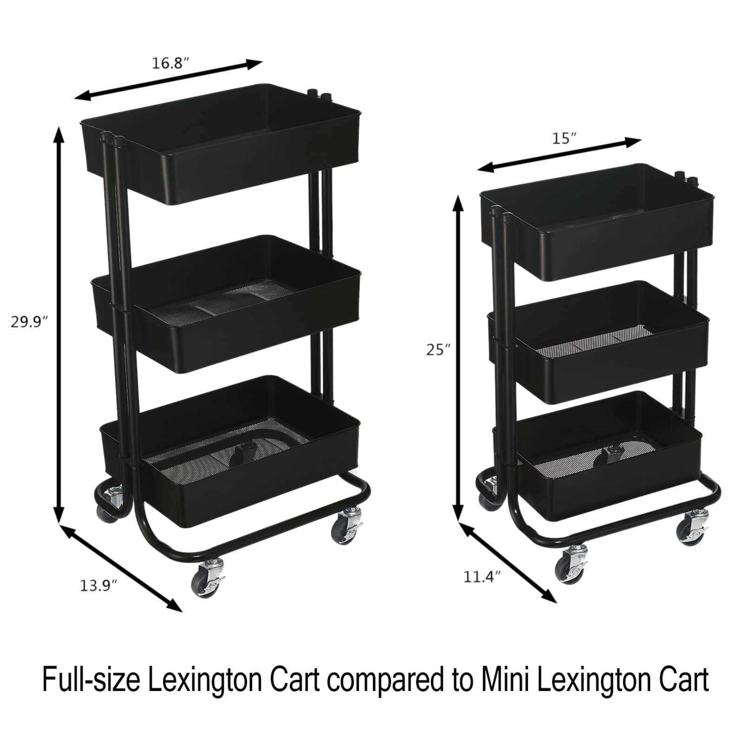 Make organizing your space a bit fun and stylish with this mini Lexington rolling cart. This mini version of the Lexington rolling cart is compact and perfect for glitter, beads and craft supplies. Keep your craft items within reach as the convenient wheels let you move it around for enhanced comfort and ease of use. Black. 15” x 11.4” x 25” (38.2cm x 29cm x 63.5cm) assembled size. Maximum 6.6 lb. (3 kg) load limit per tray. Adult assembly required. To prevent cart from being top-heavy and tipping over, place heavier items in the bottom drawers. Set cart on a level surface only. Metal and plastic. 3 metal mesh trays. 4 plastic wheels (2 locking).