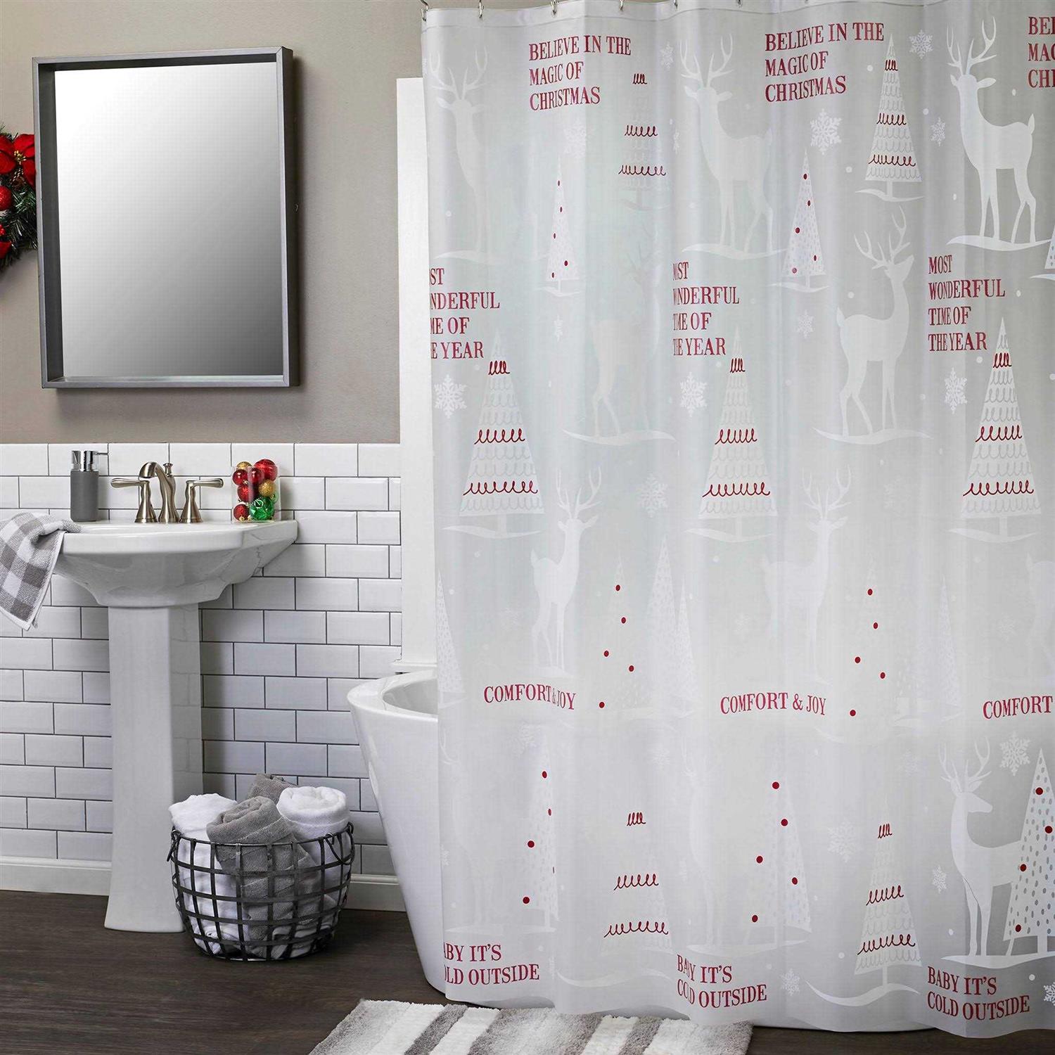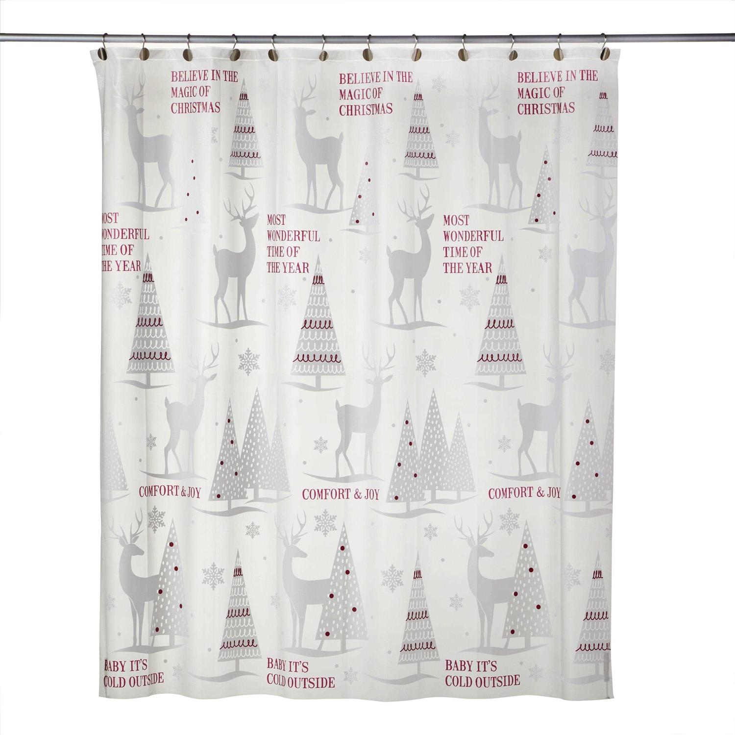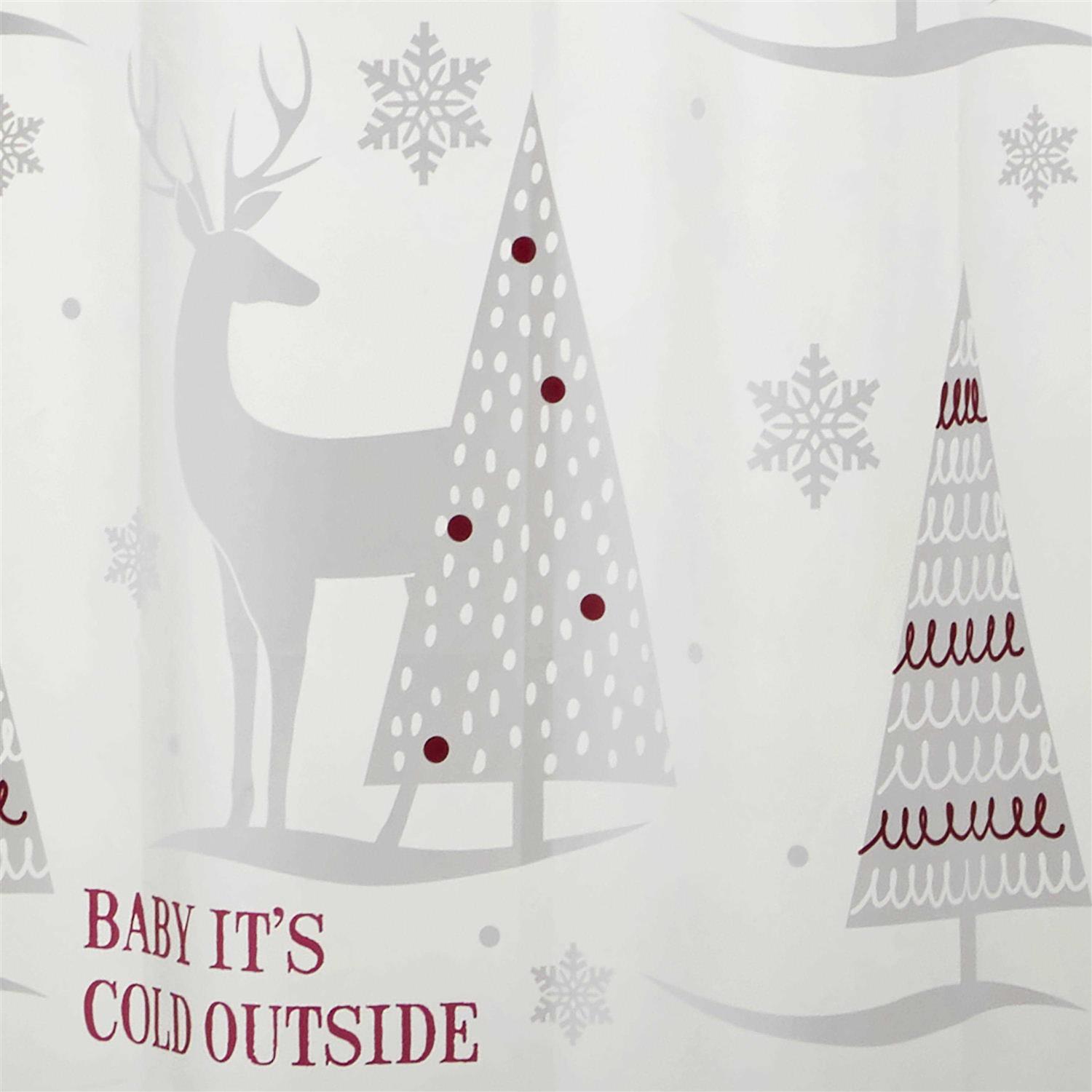 Add extra holiday cheer to your decor. This festive grey design features a reindeer and tree motif with seasonal song lyrics. Made of PEVA it easily wipes clean and features 12 button holes along top for easy hanging (hooks not included). SKL Home brings personality, fun, and flair to the most intimate spaces in your home, with products ranging from bath accessories and shower curtains to towels, curtains, and beyond. Whether your style is upbeat and modern or classic and cozy, SKL Home provides a look to complement almost any decor. Combining 40+ years’ experience, global design inspiration, and premium fabrications, SKL Home continues to lead the way in home accessories. Includes 1-shower curtain Grey peva design with a reindeer motif and seasonal sayings 12 button holes along top allow for easy hanging; hooks not included Peva 70 in. x 72 in. Wipe clean with a damp cloth Imported Discover some virtuous fairness to any bathroom in your living space with the choice of this magnificently designed SKL Home Reindeer Woods Shower Curtain.