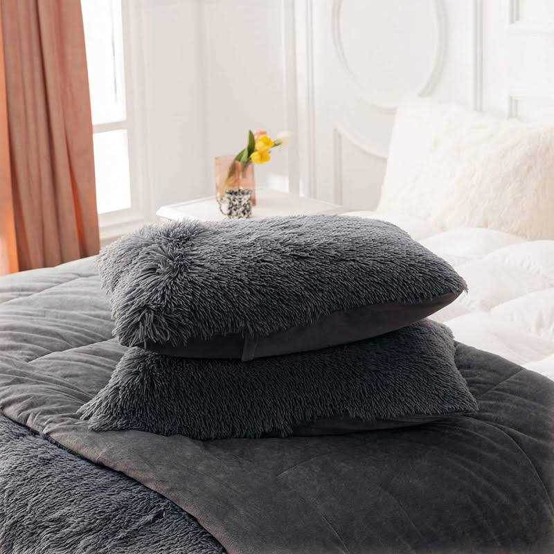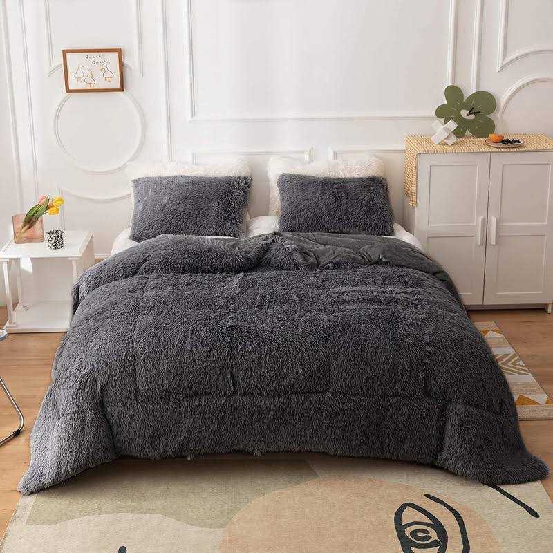 SUPER SOFT AND FLUFFY: This is a double-sided fluffy comforter set. The front of the dark grey plush comforter is cozy faux fur plush and the reverse is smooth comfortable crystal velvet. QUEEN SIZE: 1 dark grey faux fur comforter (with insert) 90inch X 90inch; 2 furry pillowcases 20inch X 26inch. WARM AND COMFORT: fluffy comforter set queen make you warm and cozy during the cold weather. Meanwhile, this queen plush bed set is light enough that you don’t overheat. Dark grey faux fur bedding set offers warmth, comfort, and chic contemporary update to any dormitory, bedroom. ALL-SEASON: This dark grey faux fluffy shaggy comforter gives you the most comfortable feel when you are about to fall asleep or rest in the cold winter. You can also use it as a blanket to protect against excessive air-conditioning in the summer. MACHINE WASHABLE: Please gentle cycle with washing bag separately in cold water. Maybe shed a little when opening. It’s not a problem after wash. p Color: Dark Grey | Size: Queen br br Description: br 1. Fabric: 100% premium faux fur & crystal velvet. Breathable soft reversible dark grey faux fur comforter set queen keeps your body warm all night long for sound sleep. br 2. Stitching Technique: plush comforter set queen is highly durable with high tensile strength, making it strong and less likely to rip or tear. br br Specification: br Queen Size br 1 X Comforter: 90″ x 90″ br 2 X Pillowcases: 20″ x 26″ br br Package included: br 1x fuzzy Comforter set br 2x Pillowcases(without insert) br br Note: br 1. Please allow 1-3cm difference due to manual measurement . br 2. Please note that slight color difference should be acceptable due to the light and screen. /p