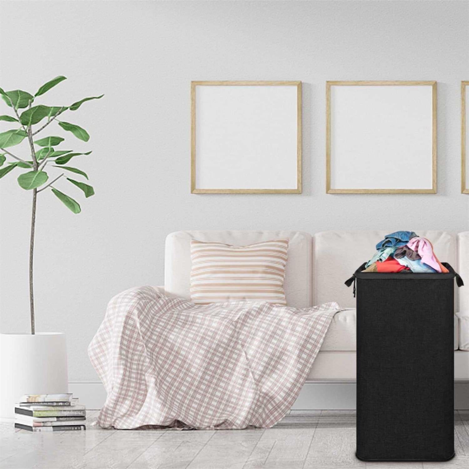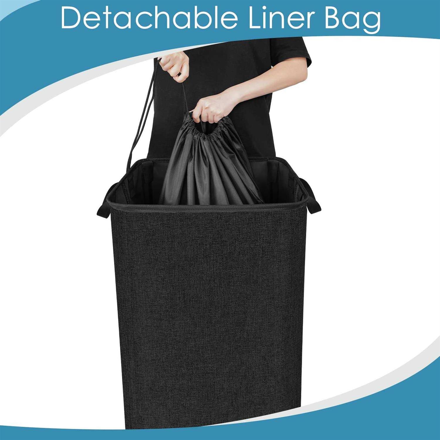 Removable liner bag Removable liner bag Heavy-duty imitation linen fabric 100L extra large capacity holds 3 loads clothing Freestanding even though it’s empty Foldable for space saving 100L EXTRA LARGE CAPACITY: The laundry hamper measures 14.9″L 13.8″W 30.9″H with a 100L large capacity, which stores clothes for a week or even a family, toys, towels, blankets, plush toys, sheets, etc., saves you from the mass of laundry work! The laundry hamper is large enough to accommodate 3 loads of dirty laundry, which are extremely useful and offer endless storage possibilities. FREESTANDING STRUCTURE: This laundry basket is 30.9″ tall heavy-duty imitation linen fabric, easy to assemble, and has 4 strong fiber rods and a metal-wired frame to support the sturdy structure. The laundry basket will maintain its shape without collapsing, and stands up well even if it’s empty. Large laundry baskets are the best gift for families, mothers, fathers, sons, daughters, friends, college students, etc. FOLDABLE FOR SPACE SAVING: It only takes 10 seconds to remove the support rods. The laundry basket can be folded up for space-saving storage when not in use, compacted into a small shape of size 15.75″L*13.39″W *2.17″H. The collapsible laundry bin folds up easily for compact storage, are perfect for gifting on Father and Mother’s Day, Valentine’s Day, Thanksgiving, Christmas, etc. REMOVABLE LINER BAG & DURABLE HANDLE: The storage basket comes with an extra washable liner bag, and the inner drawstring can be tightened to protect clothes from falling. The laundry hamper features 2 forced durable nylon handles. The handle is tightly stitched and durable to carry, even heavy loads no tearing, suitable for the elderly, and pregnant women to easily carry contents up and down stairs or in a laundromat. MULTIFUNCTION STORAGE BASKET: Large capacity laundry basket can store a lot of clothes or toys, very perfect for closet, corner, bedroom, bathroom, laundry room, apartment, or dormitory. Very suitable for family use, housewives, the elderly,and college students. NOTE: Simply use a wet cloth to wipe off the dirt or rinse off dirt under cold water. Do not clean in washing machine and dryer. ——Looking for an organizer for your home? ——This 100L black laundry hamper solves all your problems. Wide opening at the laundry basket top and sturdy wire frame sewn into the top edges is suitable for any clothes, coats, pants, shoes, bath towels, sheets, bedding, tools, sports equipment, which is a humanize constructed clothes organizer. This extra large storage basket comes with a removable liner bag, double storage space saves you extra cost and saves more space for your small house. Foldable laundry hamper is very easy to carry around and store. The cotton linen fabric is easy to clean, just wipe it with a damp cloth to clean it up. It fits well into a corner of a closet, bathroom, bedroom, living room, laundry room, or other small narrow space. Easy to assemble, only needs 10 seconds to assemble or fold, so it is also suitable for camping and traveling. 30.9 inches durable storage bin comes with sturdy support rods, is made from this thick cotton and linen material is different from other laundry baskets. It can better maintain the shape of the laundry hamper and make it stands straighter even the hamper is empty. The durable handle prevents the basket from tearing due to heavy loads. Whether you need to hold your clothes with our compact hamper, it can all help you solve it. If you are tired of the mess in your home, please don’t hesitate, just organize your home with our multi-function bedroom storage basket now.
