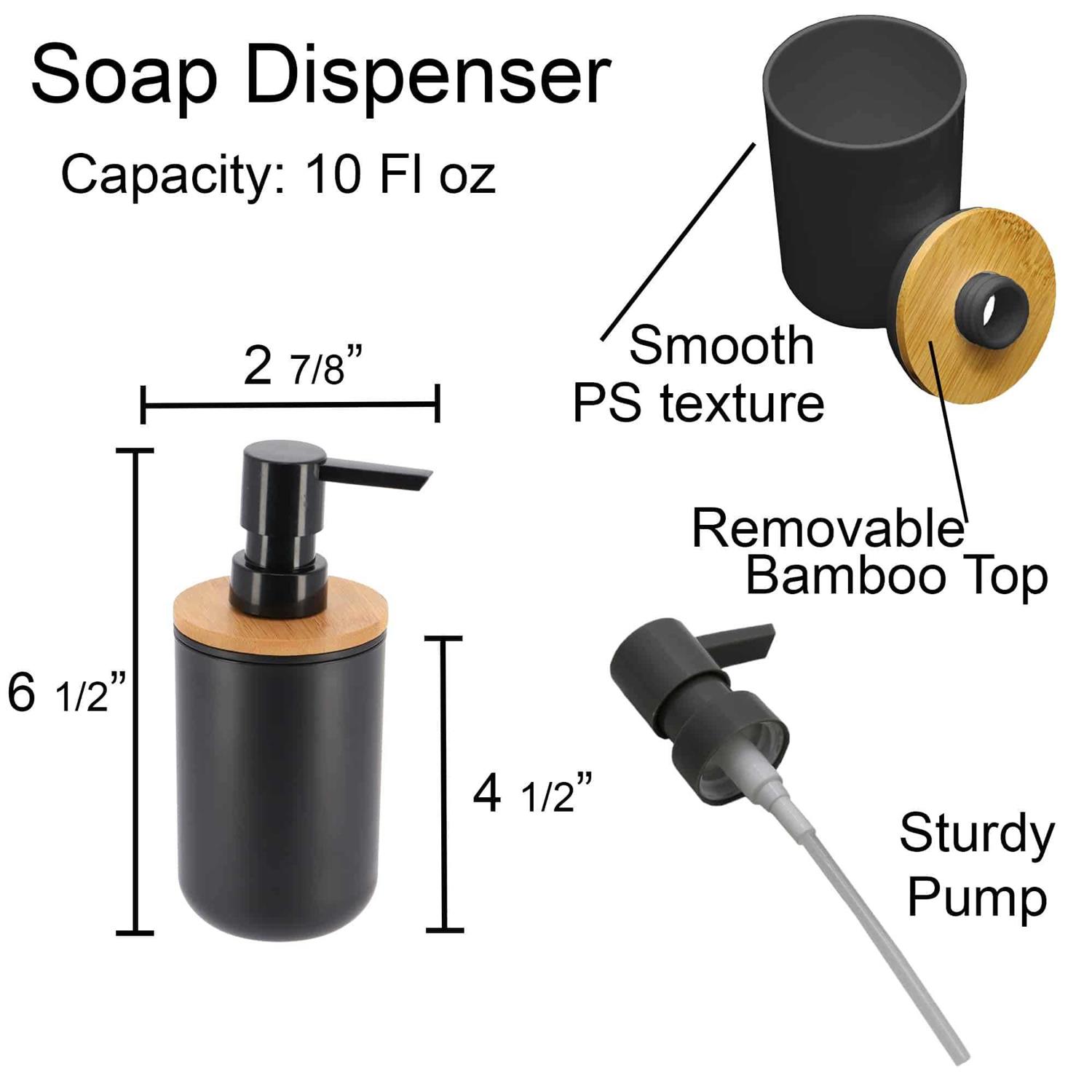 - Upgrade your kitchen and bathroom countertops with the black soap and lotion dispenser with bamboo top. The perfect fusion of style and functionality!