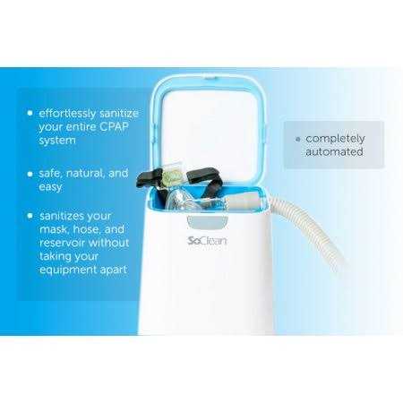 The SoClean is an automated CPAP equipment cleaner and sanitizer. Now with the available ResMed AirSense 10 Heated Hose Adapter, users can experience sleep like no other. The SoClean sanitizes and disinfects your CPAP accessories such as your mask, hose, and water reservoir (including the water inside) without needing to take any pieces apart. Full and complete sanitizing is accomplished without any messy chemicals or even the use of water. Your equipment remains completely dry. The SoClean CPAP sanitizing machine uses safe, natural, activated oxygen to thoroughly sanitize your entire CPAP system by eliminating any mold, bacteria, and viruses it comes in contact with. The inside chamber was designed specifically so that multiple mask types can be used within the SoClean unit, from nasal pillow masks to full CPAP masks. The inside chamber dimensions are 5.5 inches length x 5.5 inches width x 7.25 inches. Most full face masks will fit inside the chamber with the exception of a total face mask that covers the entire face.