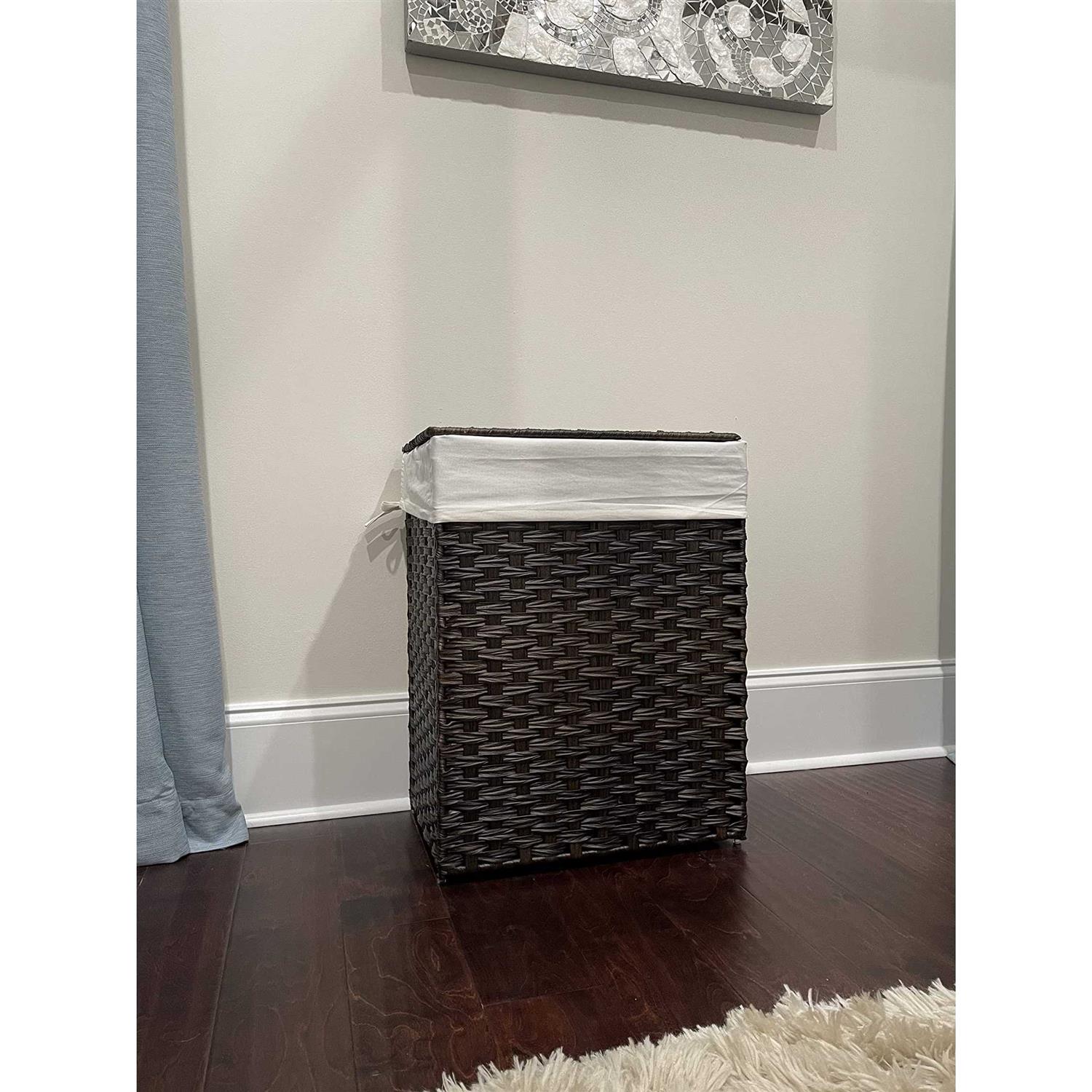 An Organized Home Is a Happy Home: Its easy to toss your dirty clothes on the floor. But not only does it make your home look disorganized, it results in you spending more time gathering up your clothes than necessary when it comes time to wash them. With a proper laundry basket, you can put an end to messy bedrooms and welcome in a stress-free, organized sanctuary youll love to look at. With the 18.1L x 13W x 23.6H (46 x 33 x 60 cm), 18.5-gallon laundry hamper, you can easily toss in your dirty clothes and bring them where you want. The liner bag ties to the basket so it wont fall to the bottom, while it still remains easy to take out and carry. Handwoven Beauty: The handwoven synthetic rattan adds a touch of class anywhere you decide to place it. Because of the quality synthetic rattan and metal frame, you wont need to worry about rust or water damaging your clothes or hampereven in damp rooms like the bathroom. The basket is also great for storing toys in the playroom, games in the family room, or supplies in your workshop. It supports a variety of items, up to 55.1 lb (25 kg).