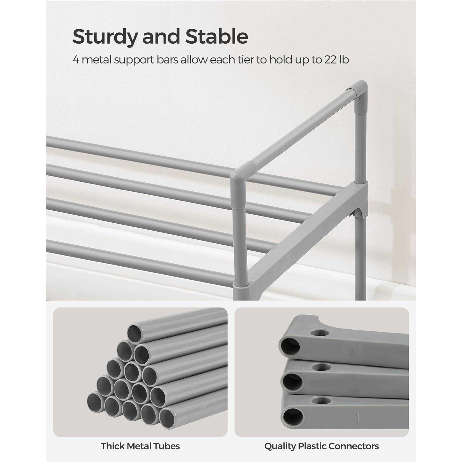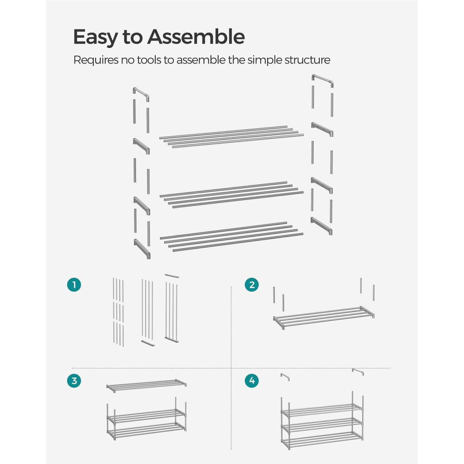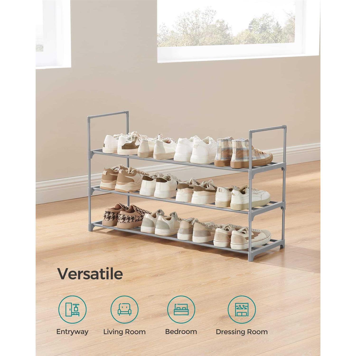 [Holds a Lot] Keep your shoes in order and easy to access with this 11.8″D x 36.2″W x 21.7″H shoe rack. It’s spacious enough to fit up to 12 pairs of men’s or 15 pairs of women’s shoes [Robust and Durable] Connected by quality plastic connectors, this shoe tower made of thick metal tubes holds up to 22 lb per tier, giving your footwear a reliable home [Easy Assembly] A simple structure, numbered parts, and illustrated instructions make this shoe shelf a breeze to assemble. Even better, no tools are needed! [Easy to Clean] With a smooth coating, this shoe storage organizer is easy to wipe clean with a soft damp cloth, saving you time and energy [Versatile for Any Room] This metal shoe shelf features a simple design and a compact silhouette, making it perfect for your closet, entryway, bedroom, or your living room Specifications: /br – Color: Grey /br – Material: Metal Tube, Plastic Connector /br – Product Size: 11.8″D x 36.2″W x 21.7″H (30 x 92 x 55 cm) /br – Product Weight: 2.9 lb (1.3 kg) /br – Max. Static Load Capacity per Tier: 22 lb (10 kg) /br – Overall Max. Static Load Capacity: 66 lb (30 kg) /br /br Package Contents: /br – 1 x 3-Tier Shoe Rack /br – 1 x Instructions /br /br SONGMICS Notes: /br – Children are not allowed to climb on or play with the shoe shelf for safety. /br – Please don’t use the shoe organizer outdoors.