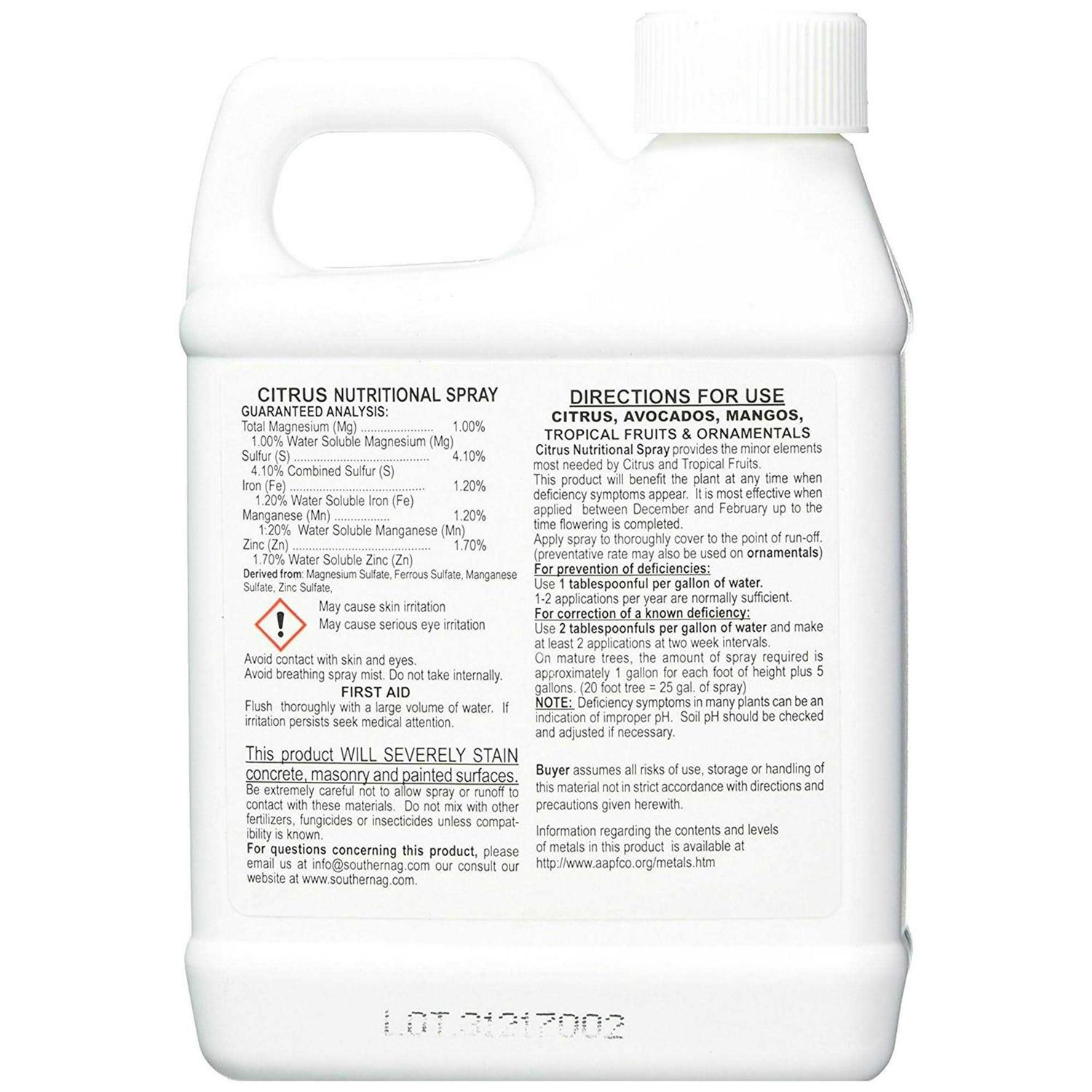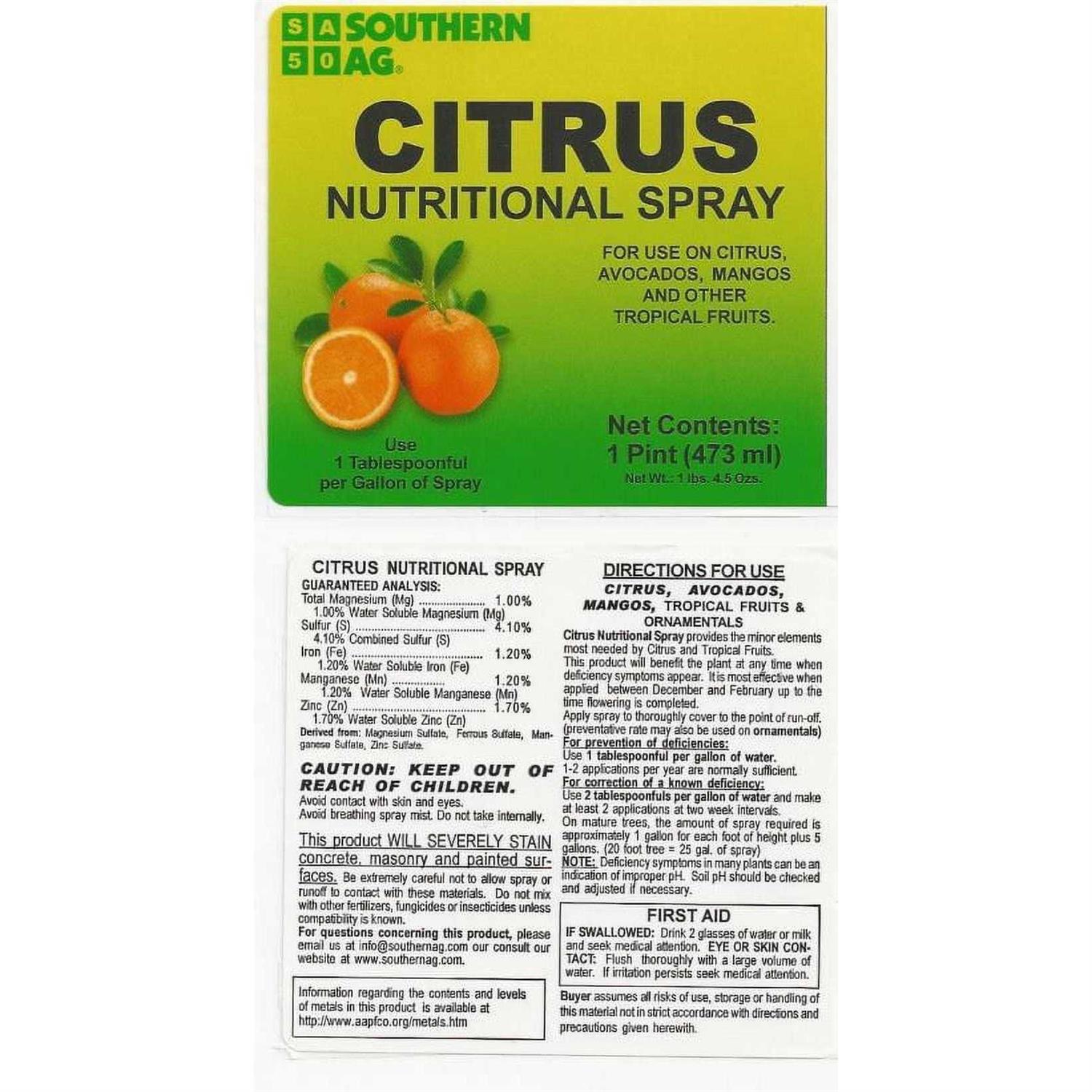 Southern Ag 1-pint citrus nutritional spray plant food contains 5 essential nutrients to help keep citrus, avocado and mango trees healthy. The iron, zinc, manganese, magnesium and sulfur correct and prevent deficiencies that cause yellowing and poor fruit development. Use 1 tablespoon per gal. of spray.