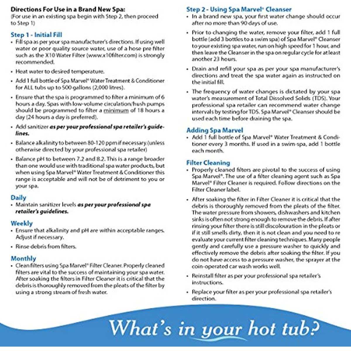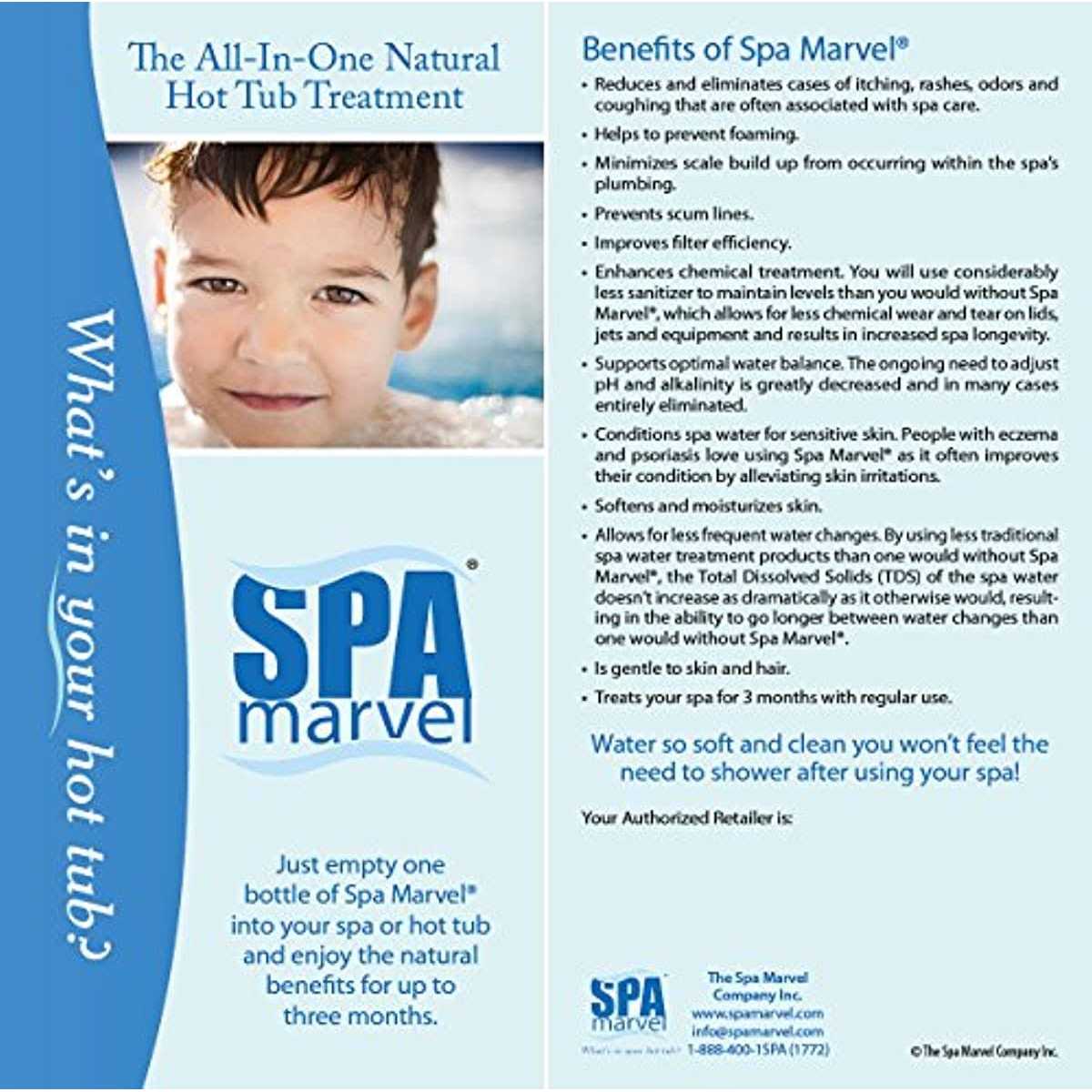 The Spa Marvel Water Treatment & Conditioner product is an enzyme based liquid formula that makes taking care of your spa easier and swimming more enjoyable. Using this product regularly (every 3 months as directed) will enhance the clarity, comfort, and odor of your spa. Adding this product will require you to use less products while using the Spa Marvel Water Treatment. Not only will this water conditioner make the water softer, but it will maintain pH and alkalinity, remove and prevent stains and scaling, and reduce the amount of foam in the water.