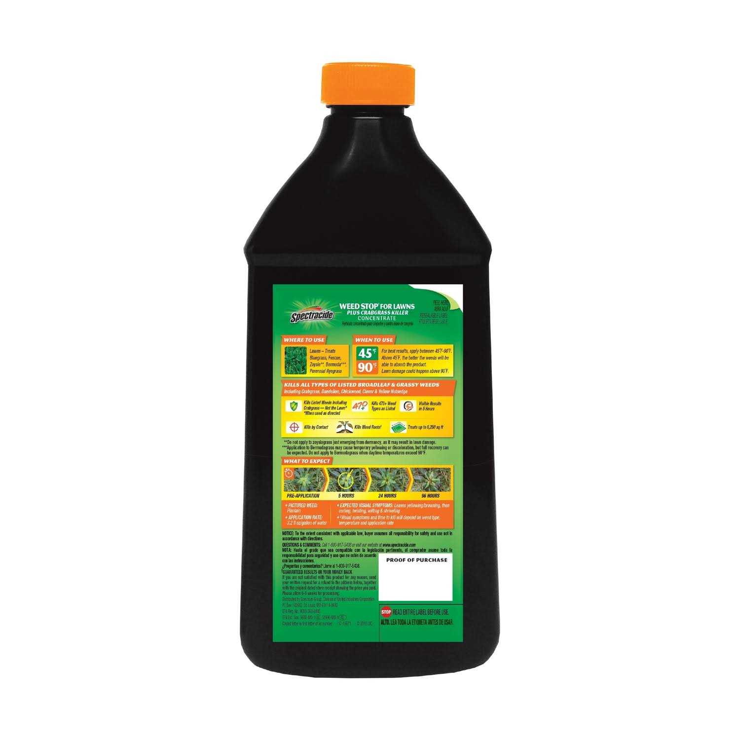 Use the Spectracide weed stop for lawns plus crabgrass killer concentrate to kill over 250 types of weeds as listed, including crabgrass. The product produces visible results in 8 hr. This product kills broadleaf and troublesome grass weeds including dandelion, chickweed and clover as well as crabgrass, foxtail and yellow nutsedge, see product label for complete list of weed types. Apply when daytime temperatures are between 45 to 90 deg F. Do not apply to Bermuda grass when daytime temperatures exceed 85 deg F.