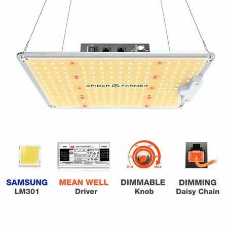 Top Features 2022 VERSION LOWER RUNNING COSTS & HIGHER-QUALITY YIELDS: SF1000 LED grow lights utilize the latest in high yielding LEDs technology today-Samsung LM301B diodes, high energy efficiency with 2.5 umol/J, delivers powerful light output and uniform canopy penetration to resulting maximum higher yields. Only consumes 100w, running 50% less power than the HPS or other SMD LEDs or Blurple lamps. Veg footprint is 3 x 3 ft, Flowering footprint is 2 x 2 ft. NEW DIODE LAYOUT & DIMMING DESIGN: Newest upgraded SF1000 growing lights, the diodes arrangement gathered at the edge makes the PPFD more uniform, absorb light better, produce higher yields. The dimming knob be adjusted the light intensity at liberty. Multi-light Connection with unified dimming especially beneficial for large area of indoor growing and commercial planting. IDEAL FOR ALL GROWTH STAGES: Excellent full spectrum- white, blue, red and IR (3000K, 5000K, 660nm and IR 760nm, IR is dimmer than other red diodes.You can wear glasses to see it ). 3000K providing more reddish light and the 5000K providing more blueish. The 660nm red and IR light is especially useful during bloom, where it speeds up flowering time and boost yields. Uniformly across the surface and deep into the roots and bottom of canopy for consistent, highest quality flowers. WELL MADE & SOLID CONSTRUCTION: No Fan Noise Free. High Efficient, reliable and detachable SPIDER FARMER Brand Driver have great dissipate heat. Aluminum heat sink is thick and sturdy, protective covers for cables; User-Friendly Packaging. Quality components mean the light lasts longer, SF Light takes good cares of you with more considerate design, you can easily save money without purchasing lights frequently. As a professional manufacturer of Led grow lights for more than 10 years. Spider Farmer has always insisted on creating more efficient, suitable and high-quality home planting equipment for plant growth, and strives to become a trusted partner for every grower! You will get a Spider Famer SF1000 grow light, instruction manual, a pair of silver hooks, a pair of black hangers. Package includes: 1 x SF1000 LED Grow Light 2 x Stainless Steel Hanger Hook 2 x Adjustable Rope Hanger 1 x User Manual for Installation 1 x? 2 meters Power Cord(US, UK, AU, EU plug Automatically send by region)? Warm Tips:1. Do NOT touch while in operation.2. To prevent eye damage, avoid looking directly at the LEDs.3. In summer or other hot environments, please use a cooling fan to keep a suitable temperature for your plants. Specification SF1000 Spectrum 660nm,3000K,5000K,760nm IR LED 218 pcs SAMSUNG LM301B PPF 250.43umol/S PPE 2.5 umol/J Power draw 100W? 5%@AC120V-277V Coverage Max Coverage:3x3ft Core Coverage:2x2ft Lumen 16439Lm? 5%@AC120V 16327Lm? 5%@AC240V 16292Lm? 5%@AC277V Light Size 325*290*59MM Package Size 385*350*125MM Gross Weight 1.92KG DB 0dB Input Voltage AC100-277V Amp 0.8274A@AC120V? 0.4246A@AC240V? 0.3739A@AC277V Operating Temperature -20-35? Frequency 50-60HZ HPS/MH Replace<