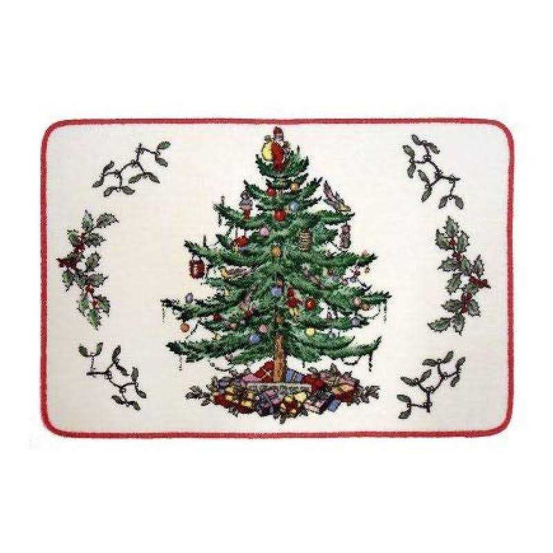 Seeing the beautifully decorated Spode Christmas tree brings back warm memories and a sense of holiday nostalgia. The sheared acrylic Bath Rug, .25″ thick, features a heat-transfer print of a tree and boughs of holly. The outer border is red. Colors include red, green, white, yellow, pink, black, brown, blue, and peach on a light cream background. Back is skid-resistant latex. Christmas bath rug measures 30″x20″. Machine washable. Imported.