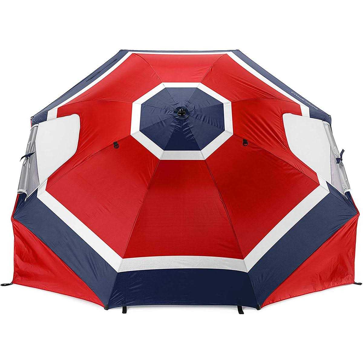 With every feature under the sun and rain, the 8 blue Sport-Brella Premiere features UPF 50+ sun and weather protection, a heavy-duty steel 1.25 center pole that pivots, an oversized auger bit with integrated twist handle and patented side panels for increased privacy. Use it at sporting events, concerts, the beach, camping, and even in the backyard. Its zippered windows open to allow in a cooling breeze while helping prevent the umbrella from blowing away. At the same time, the patented side panels include external stow-away clips that allow the flaps to be stored when the umbrellas in the upright position to increase your viewing area. Two reinforced internal pockets are perfect for storing your phone, snacks, and other gear. And when youre ready to pack up, the Sport-Brella Premiere stores easily in a reinforced carry bag that includes stakes for securing it to the ground.