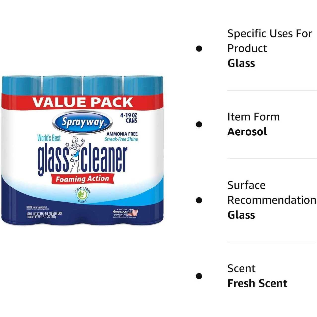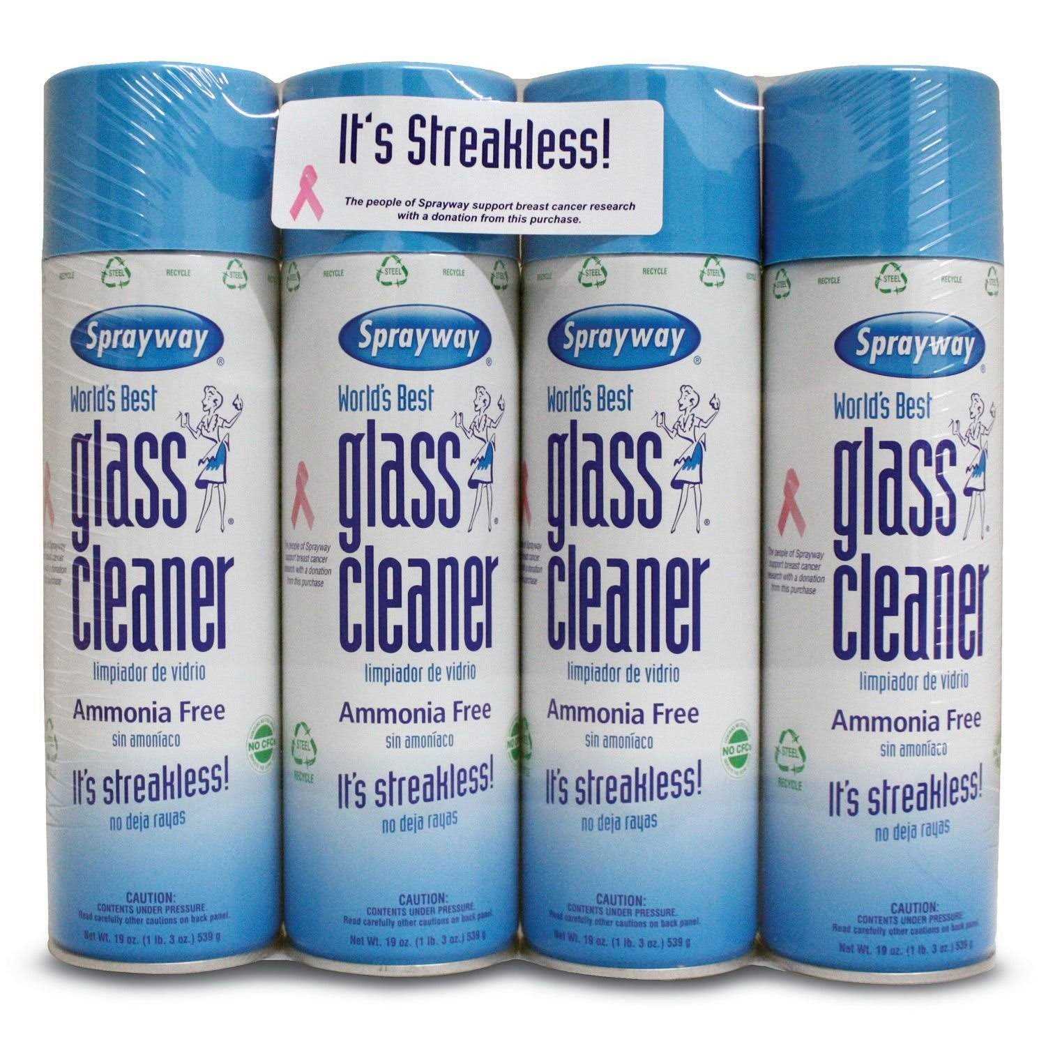 Streakless shine Ammonia free Sprayway Glass Cleaner Heavy-duty cleaning action, without ammonia. Foaming action clings and dries quickly with no residue or streaking. Economically priced, one can outlasts two 32 oz liquid trigger sprayers.