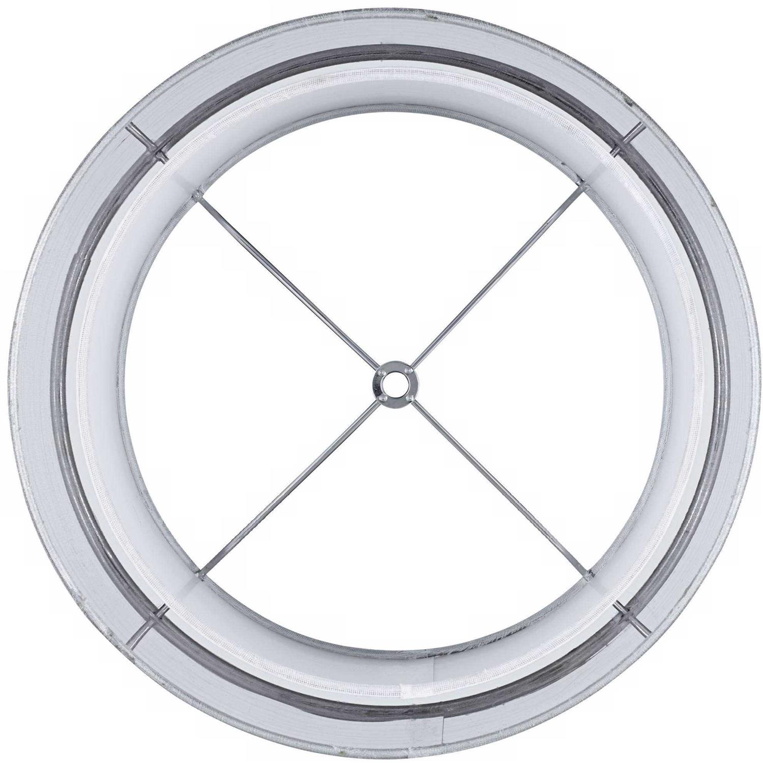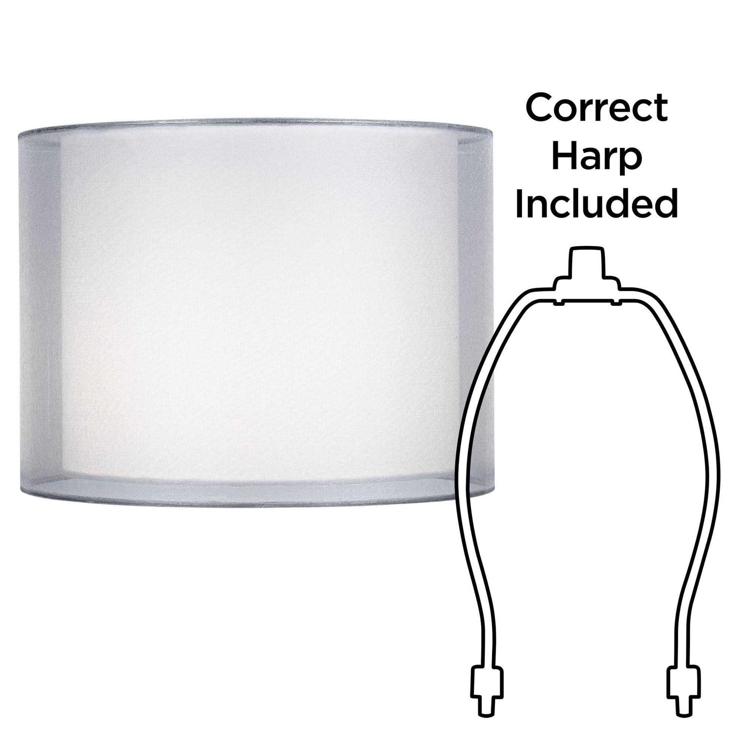 Outer shade is 12″ across the top x 12″ across the bottom x 9″ high. Inner shade is 10″ across the top x 10″ across the bottom x 8 1/2″ high. Silver finish spider fitter. From the Springcrest Collection of lamp shades. Double sheer drum lamp shade with hardback liner. Sheer silver polyester fabric over clear styrene on outer shade; white polyester fabric inner shade. The correct size harp and a finial are included free with this shade. Refresh any existing table lamp with this double sheer hardback shade. Creating a luxurious look sheer silver fabric covers white fabric inner shade for a stylish effect.