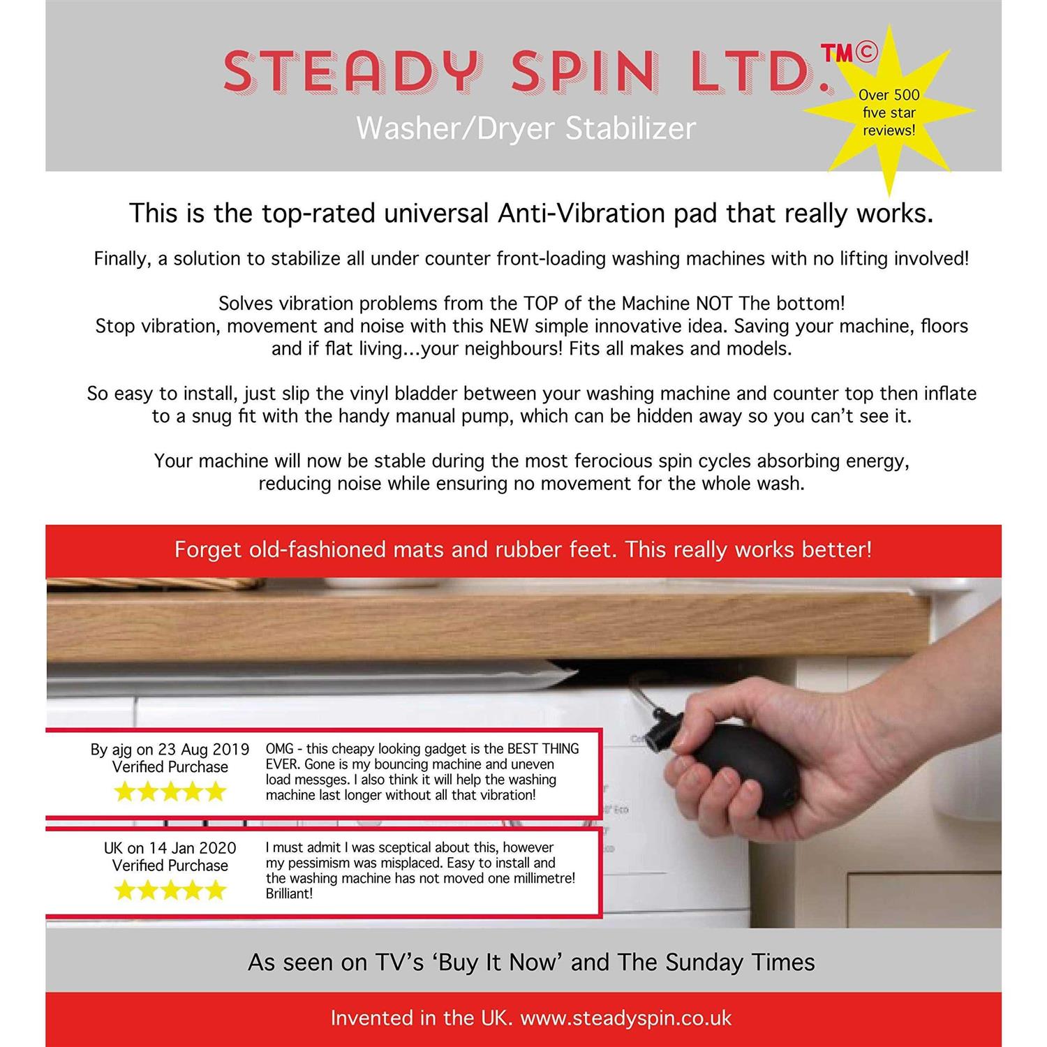 Washer & Dryer Stabiliser Pad. Finally, a solution to stabilise all under counter front loading machines with NO lifting! Simply slip this inflatable pad between your washing machine and the counter top. Then inflate with the handy manual pump to an optimum snug fit. Then slide the pump to the top or side of the machine so you don’t see it. The appliance, now stable during the most ferocious spin cycles, absorbs energy reduces noise while insuring no more movement or jumping for the whole wash. Top rated UK product with over 100 five star reviews. New to this country.