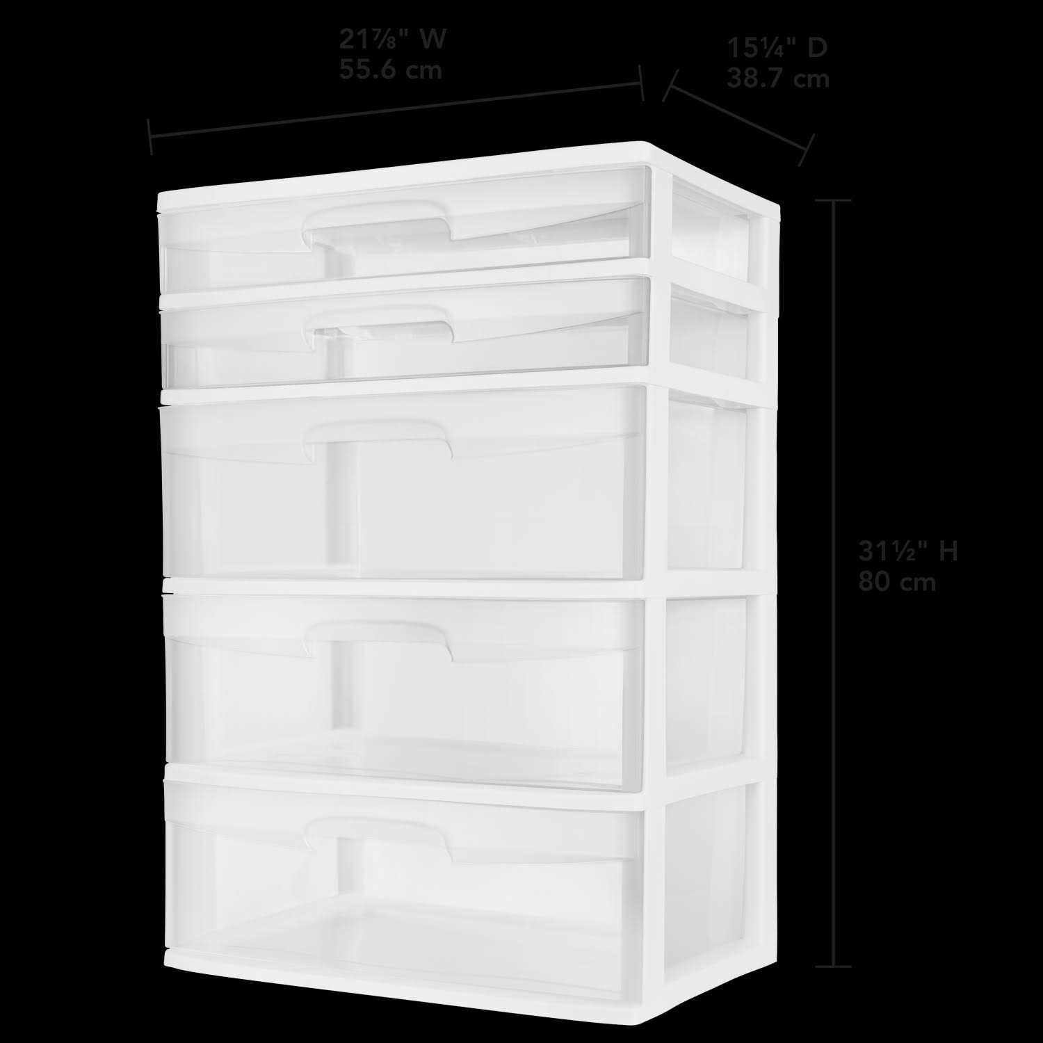 Add storage with minimal effort with the Sterilite 5 Drawer Wide Tower Black. Sterilite makes storage solutions to suit the needs of any space, from stackable bins to mobile storage carts and more. Sterilite units are remarkably rugged, made with heavy-duty plastic for years of reliable performance. This Sterilite wide tower is a freestanding storage unit, featuring shallow and deep drawers to accommodate multiple items easily. The clear drawers allow for easy identification of contents at a glance; each drawer is designed with easy, pull-out handles and drawer stops for effortless opening and closing the stops also safeguard against accidental drawer removal. A sleek black frame adds subtle contrast without compromising existing color schemes. At 15.25 inch x 21.875 inch x 31.50 inch, the storage tower can be used in just about any room, from home to office settings. It has a flat base for easy use on any flooring surface. Fast and easy assembly empowers effortless use.