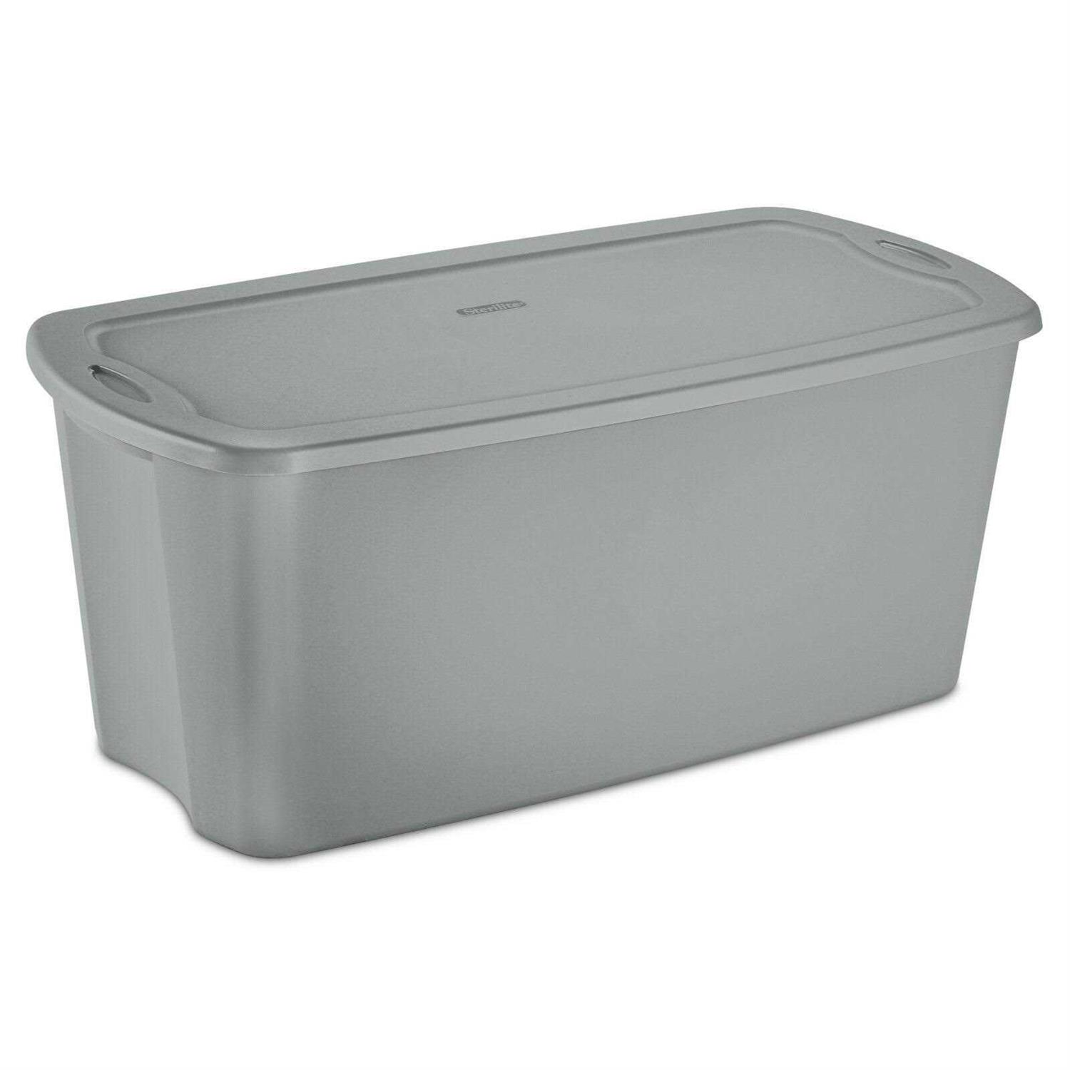 Get organized with Sterilite’s 50 Gallon Tote. This popular size tote offers classic styling, quality, and a simple means to keeping your household items organized and out of the way. The extra large capacity makes storing larger, bulkier items easier, or store multiple smaller items conveniently in one place. The opaque base helps to conceal and contain items such as off season clothing, sports equipment, camping supplies, bedding, seasonal decorations and more in the garage, basement or attic. The lid snaps tight to ensure it stays attached and contents remain in place. The indexed surface of the lid allows multiple totes to stack neatly on top of each other for efficient use of vertical storage space. The contoured end panels create a comfortable surface, making lifting and transporting easier. The overall dimensions of this item are 42 3/4 inch x 22 inch x 18 inch.