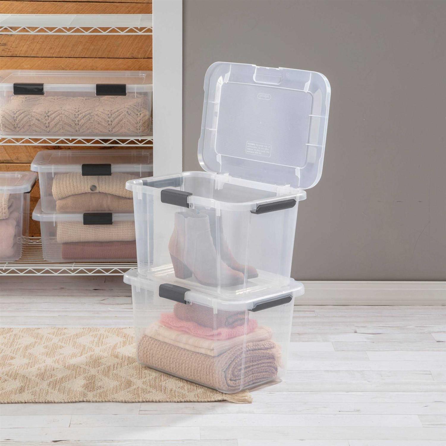 Great organization hinges on the ideal solution for your storage challenge! The HingeLID Storage Box line combines popular features such as a hinged lid for easy access, clear lid and base for quick identification of contents, and a stylish textured pattern for a dcor touch! The innovative hinged lid stays open unassisted, allowing you to use both hands, for careful handling of stored items. The lid stays attached, so no worry of it getting misplaced! For easy clean up, snap the color-accented latch to secure the lid to the base and transport the Storage Box with ease using the textured, comfort-grip handles. The 30 Quart HingeLID Storage Box is ideal for sorting and storing anything from boots and clothing to accessories and health and beauty items, craft supplies, toys, and more. Once your items are stored, the clear lid and base allows for easy viewing and retrieval of your belongings. The 20 and 30 Qt HingeLID Storage Boxes use the same lid, allowing both shallow and deep sizes to be stacked on the same footprint. The indexed lids allow for secure stacking and efficient use of that vertical storage space. The HingeLID Storage Box line is available in five sizes, ranging from 20 Qt to 80 Qt, and designed with a modern profile and textured pattern. Pick up the sizes that are best for you and dress up your storage today! The overall assembled dimensions of this item are 18 5/8 inch L x 14 inch W x 11 1/8 inch H.