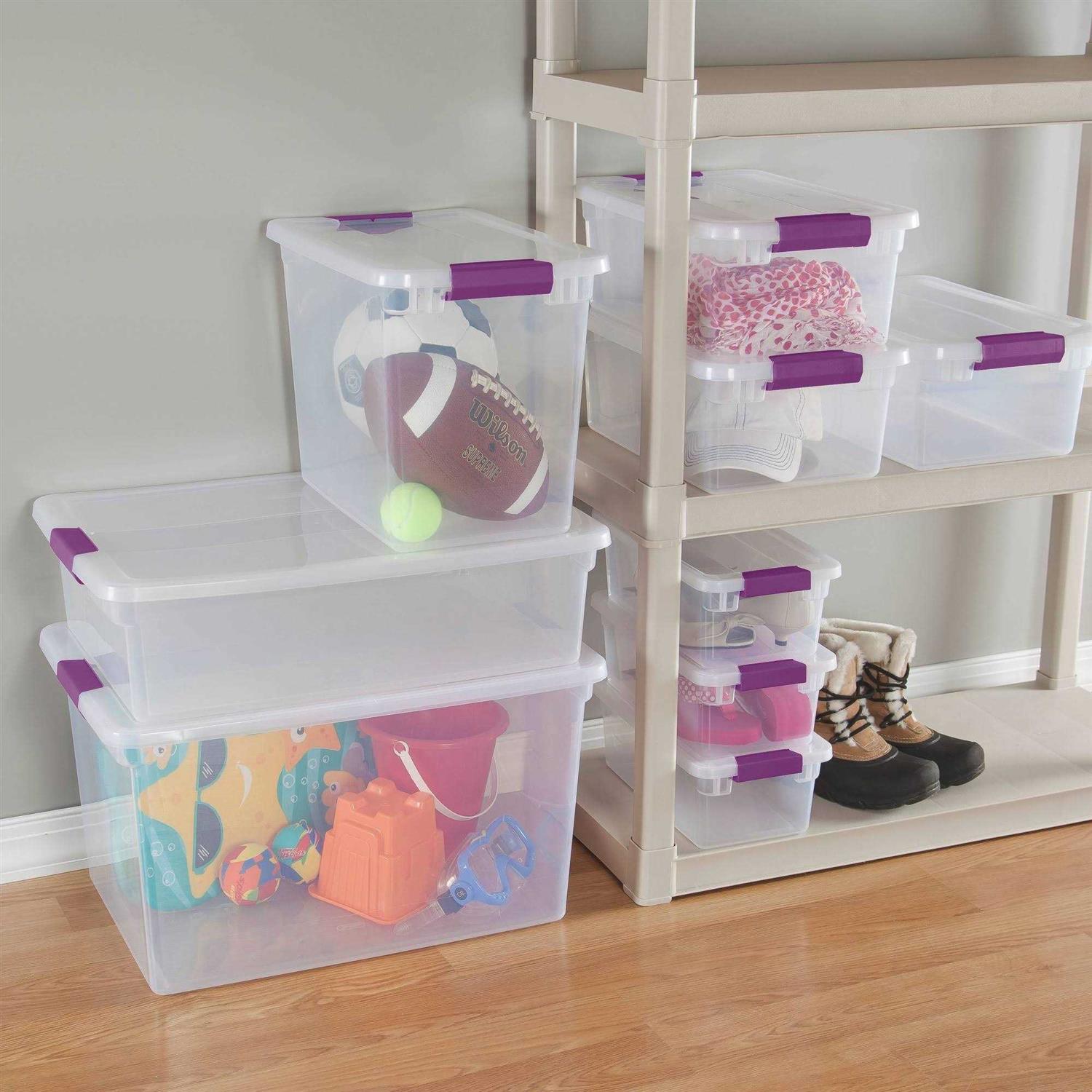 The 66 Quart ClearView Latch Box features ergonomic latches that attach the lid securely to the base, yet are still easy to unlatch. The see-through base and lid allow contents to be easily identified from any angle, and multiple bases are able to stack on top of each other. This latch storage box is ideal for storing blankets and other bulky items around the home. Sterilite ClearView Latch Boxes feature contemporary styling with ergonomic, color coordinated latches. The see through design allows for easy viewing of items. Indexed lids allow containers to stack securely for efficient storage. Common lids are used on select sizes to simplify and improve organization. Latch color adds visual appeal to everyday assortment.