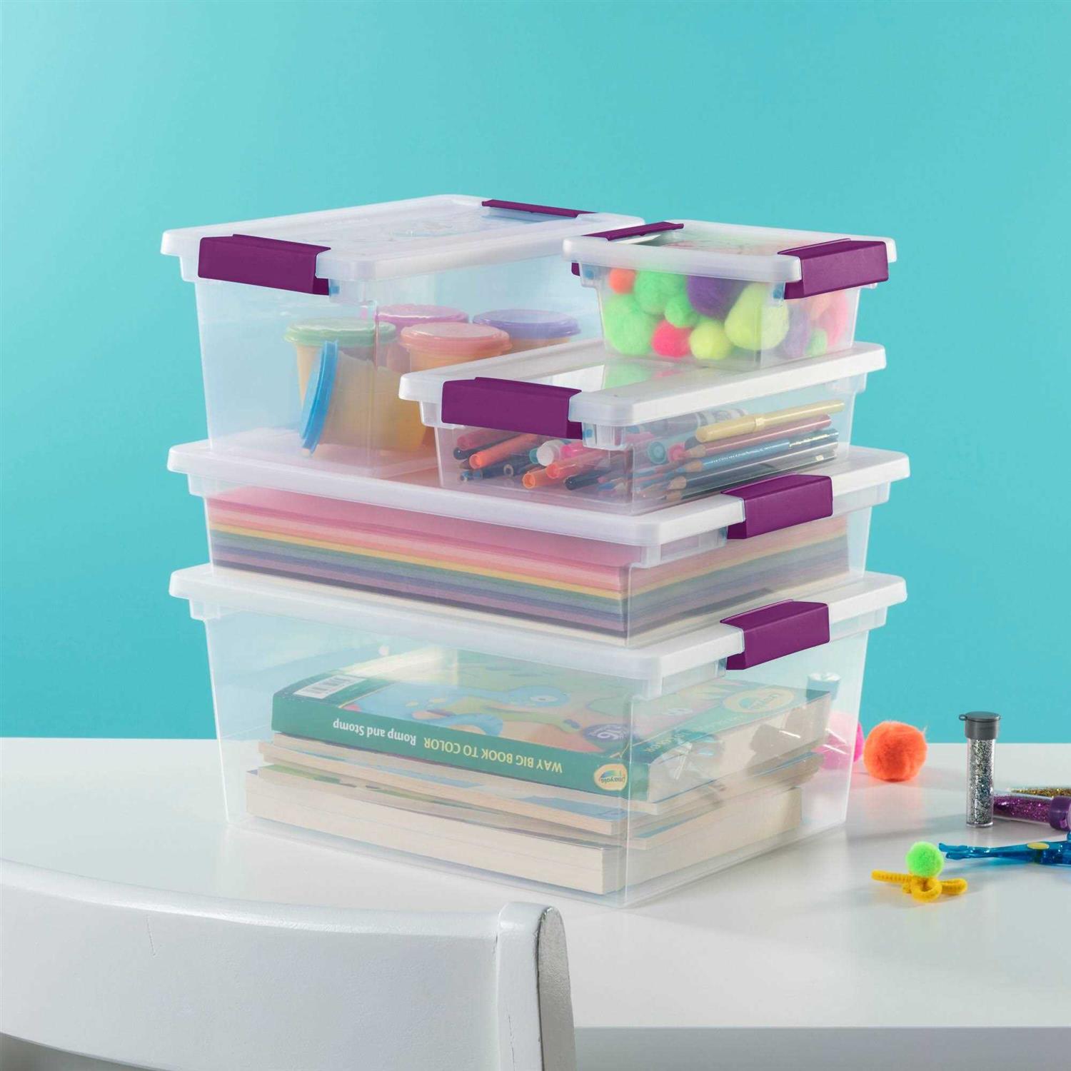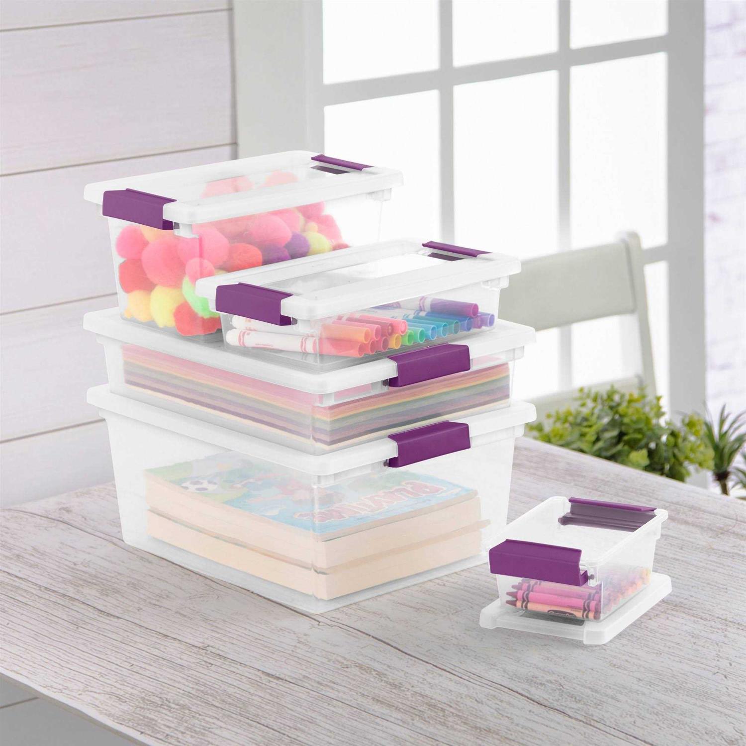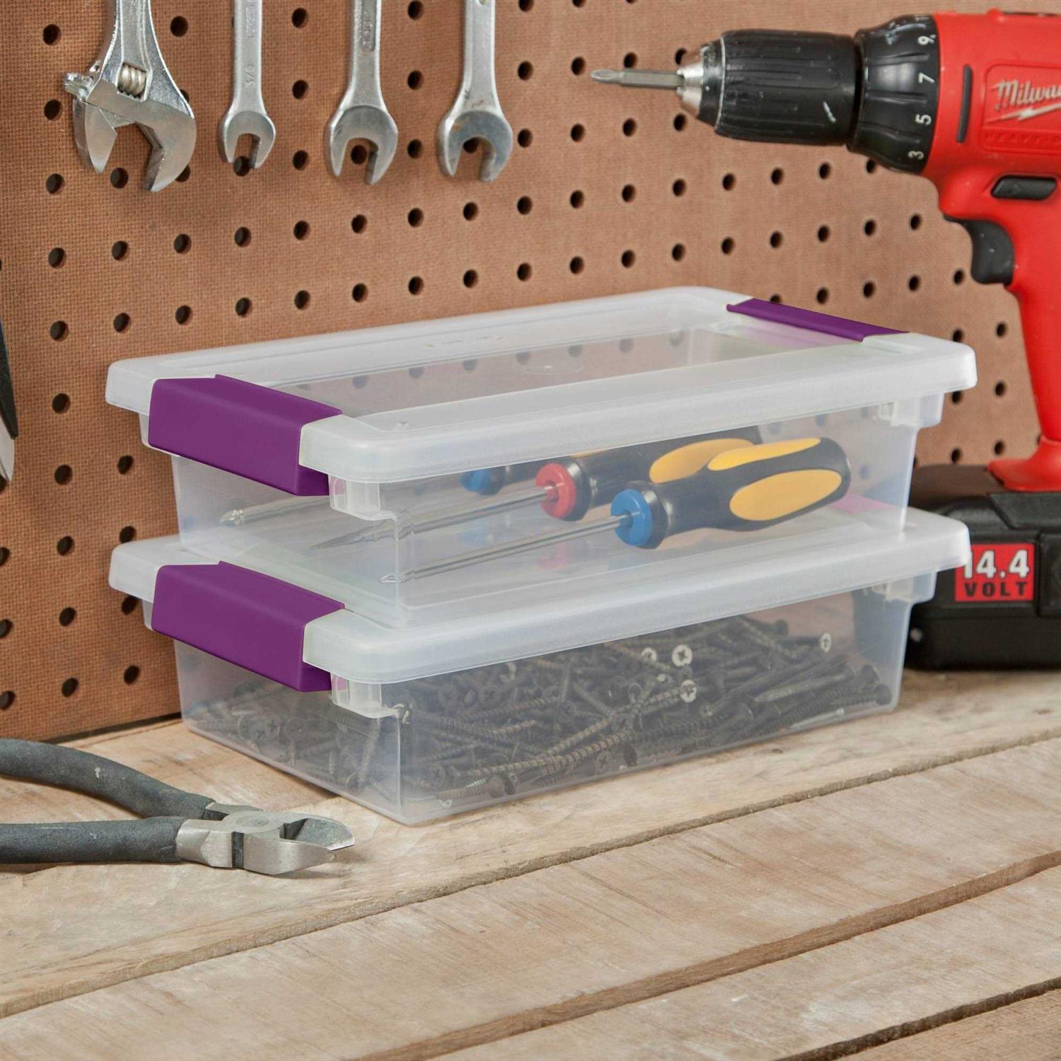 Keep your space neat and organized with Sterilite Clip Boxes! Designed to be modular, you can create your own storage system with the five different sizes. Stack Clip Boxes for efficient use of vertical storage space. The Small Clip Box is a great solution for storing and organizing items throughout the home and office, such as pencils, markers, crayons, and paintbrushes, or store screwdrivers, nuts, bolts and more in the workshop. The clear base and lid allow contents to be easily identified from any angle, and the color accent latches ensure that the lid remains secure to the base. The Small and Medium Clip Boxes share the same lid, allowing the shallow and deep size to be stored in the same footprint. The overall assembled dimensions of this item are 11″ L x 6 5/8″ W x 2 3/4″ H.