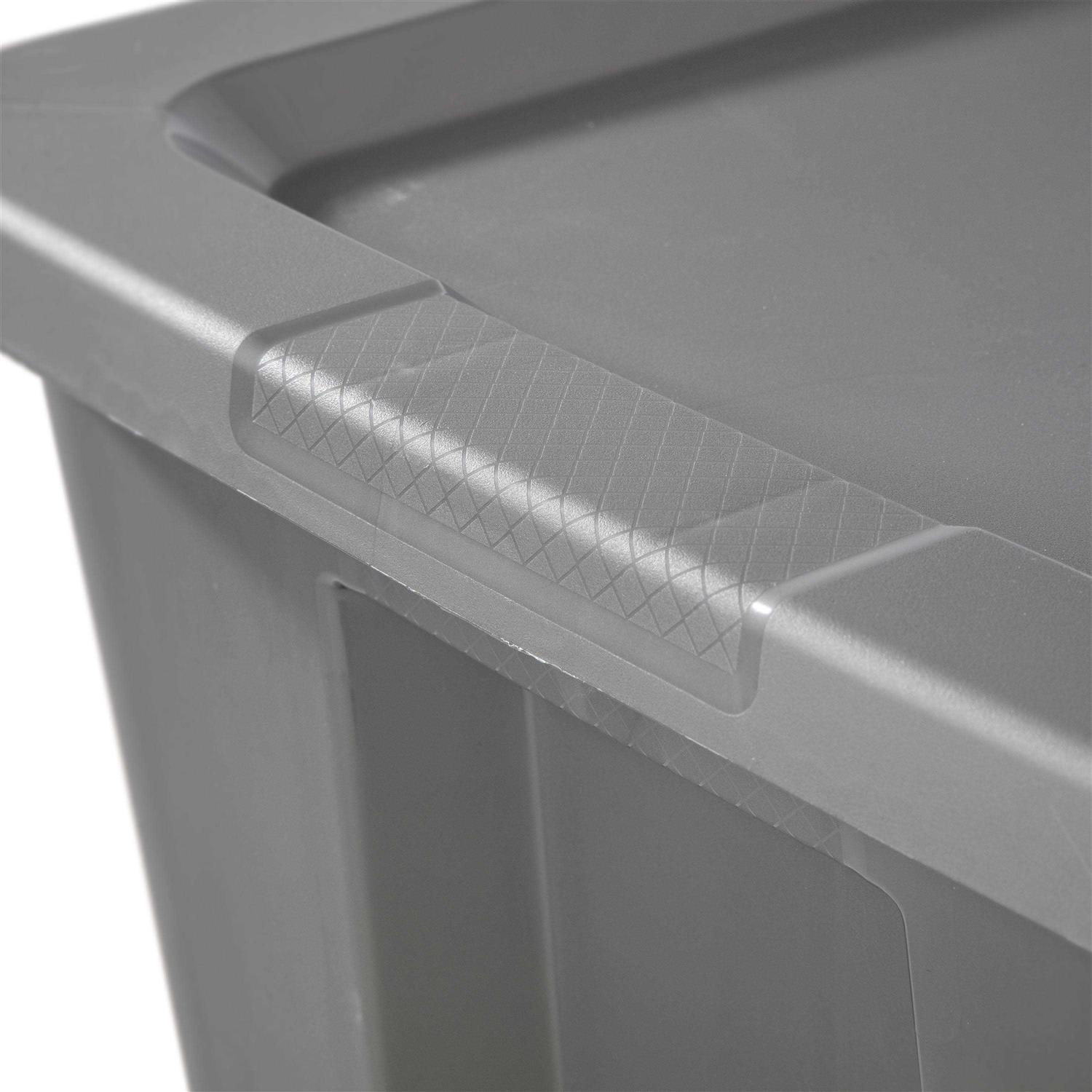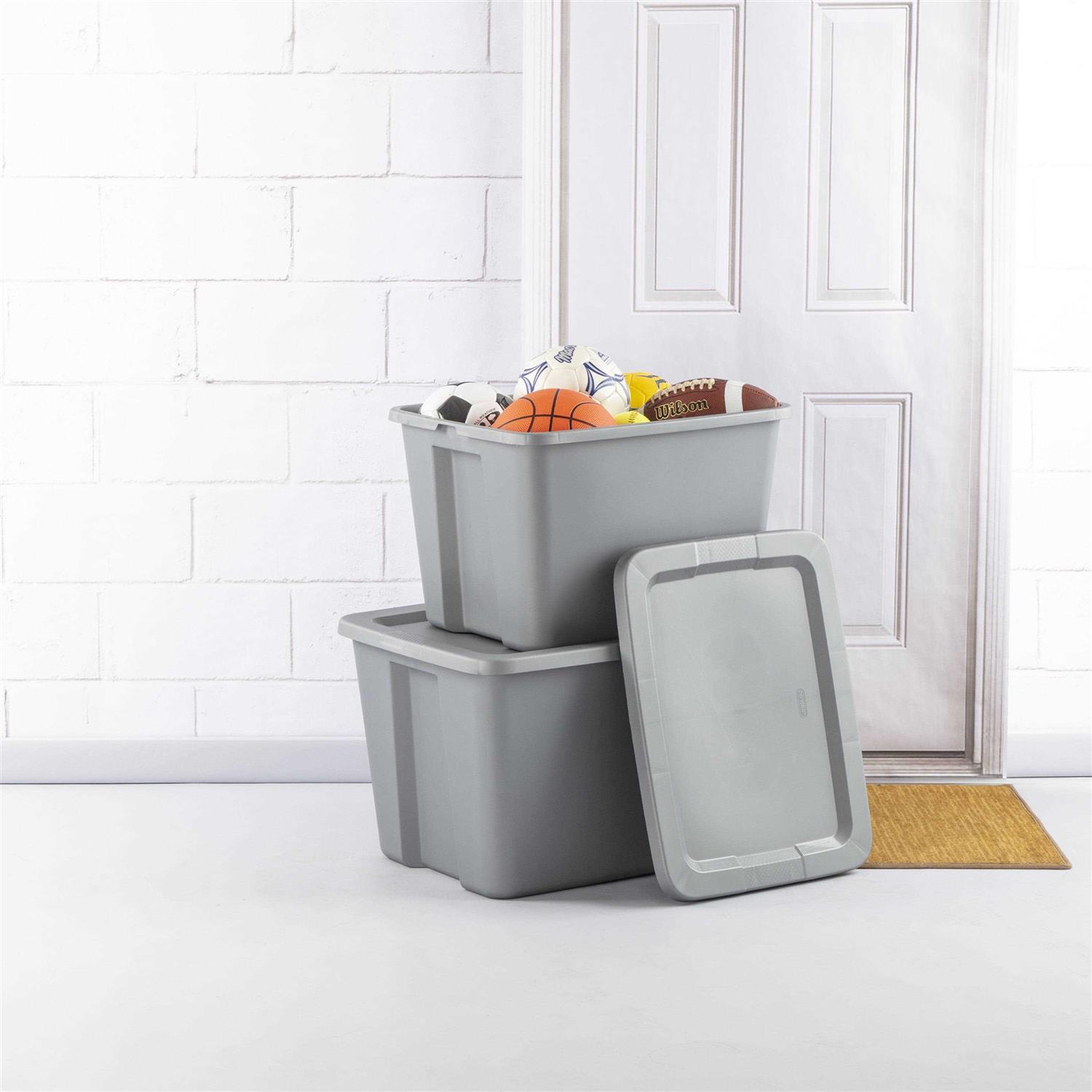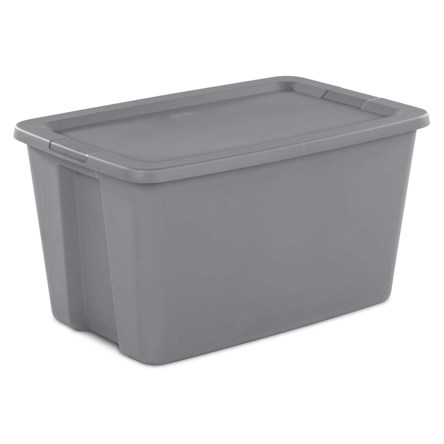 Organize, contain and store it away in Sterilite’s 30 Gallon Tote. This popular size tote is ideal for a variety of basic and lightweight household needs, such as sorting and storing bedding, sporting gear, seasonal decorations and other large, bulky items! The simple squared off design offers a space efficient shape, and a broad rim for added strength. The lid securely snaps to the base, keeping contents safely in place and concealed. The contoured end panels and textured in molded handles provide a comfortable grip for lifting and carrying, making transporting the tote easier, whether moving into a dorm or storing away belongings in the attic or basement. The deep recessed surface of the lid allows totes to stack neatly on top of each other for efficient use of vertical storage space. When storing items away, use good judgment and dont overload them or stack them too high; be mindful of the weight in each tote and place the heaviest tote on the bottom. The overall assembled dimensions of this item are 30 1/2 inch L x 19 7/8 inch W x 16 3/8 inch H.