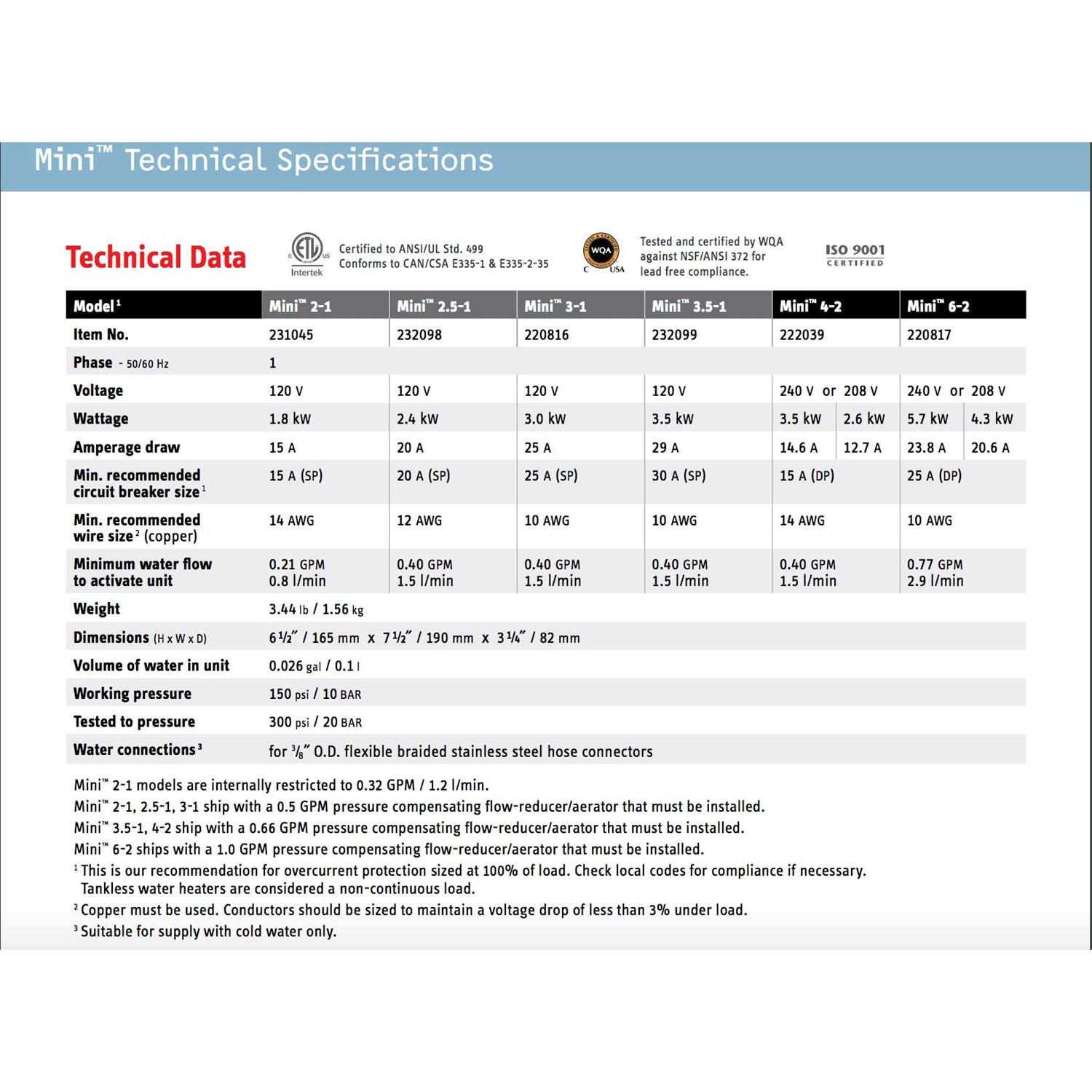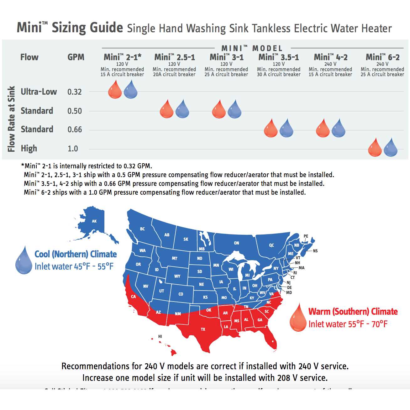 Stiebel Eltron Mini compact tankless point-of-use models excel at supplying warm water at a constant temperature for hand washing at a sink. They are ideal for residential or commercial hand-washing sink applications. The model must be carefully matched to the flow rate of the sink for proper operation. Mini tankless water heaters heat water instantaneously and endlessly at 99% efficiency as it flows through the unit. Unlike tank water heaters, they save energy because they have no stand-by energy losses. The sleek, small design allows installation with the unit visible. Venting is unnecessary. Use the Sizing Guide and Technical Data Chart to determine the correct size for your application. Meticulously engineered and carefully manufactured, Mini tankless water heaters are designed for years of trouble-free and energy-saving usage.