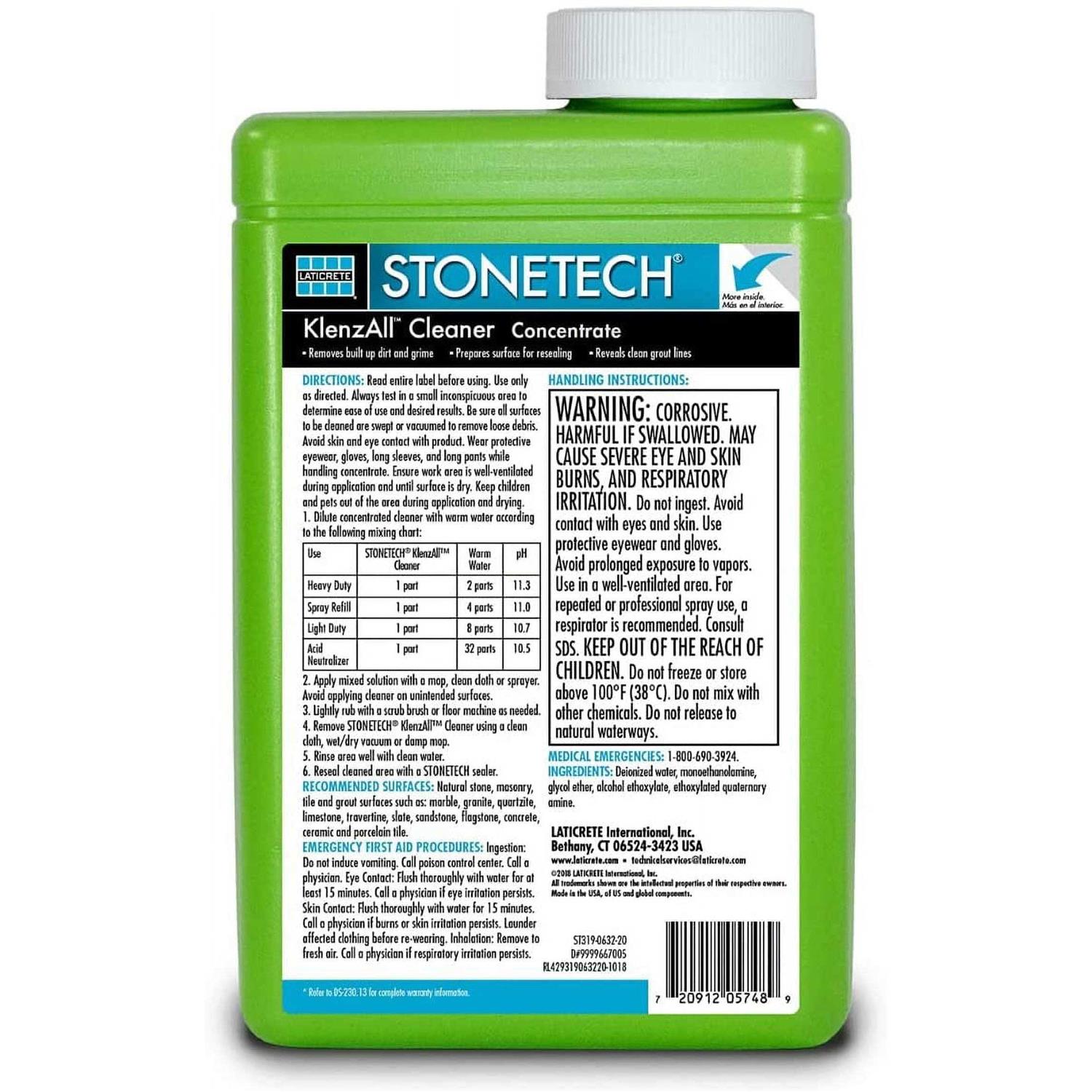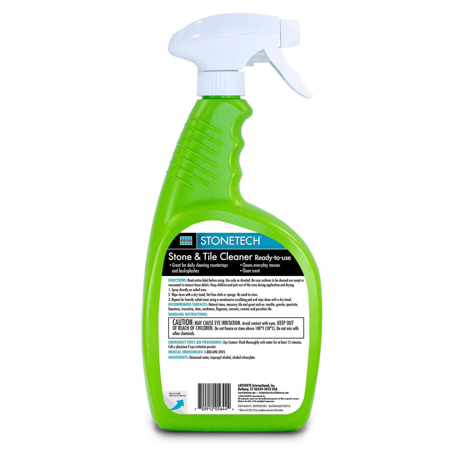All-Purpose Cleaners by StoneTech. Details:STONETECH Stone & Tile Cleaner is formulated to remove tough everyday spills, dirt and grease on natural stone, tile, masonry and grout. Unlike other household cleaners that are highly acidic and abrasive, STONETECH Stone & Tile Cleaner is pH neutral and gentle on natural stone but strong enough to tackle tough daily messes without degrading or harming the surface. Great for daily use on countertops, backsplashes, vanities, walls, floors and more. Available in ready-to-use and concentrated formulas in a clean fresh scent.