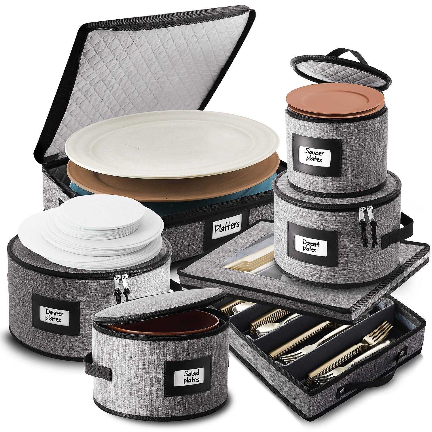 StorageBud Full china storage container set (6 pc) is high quality storage to help stay intact & dust-free. Fits up to 12 plates, Platter storage fitting 4 large, and flatware storage case serving 12; Our dinnerware storage containers are designed with optimum protection for your household essentials. Your china storage container bundle boasts convenient & sturdy handles and classy leather slots for neatly labeling each container.