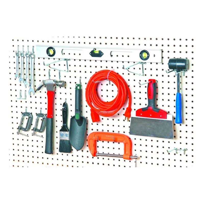 Maximize the spon your pegboard with these handy peg hooks. Features: *Tools and board in picture not included For use with 1/4″ pegboards Includes 2 shelf supports, 2 double hooks, 2 long single hooks, 6 short hooks, 2 large round hooks 2 medium round hooks and 4 small round hooks, along with 6 screws and 6 spacers for hanging board Weight capacity: 10 lbs. Item Dimensions: 12″ L x 5″ W x 2″ H