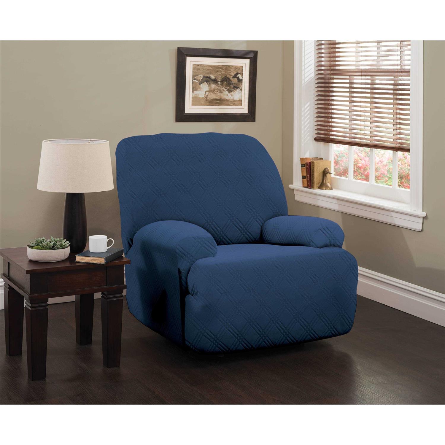 Stretch Sensations Double Diamond Stretch Slipcover with its form fit stretch construction is a quick and easy way to protect and update furniture. Geometric diagonal double diamond pattern. Stretch slipcovers are the perfect way to renew restyle and refresh your furniture. On and off in a flash. 5 minute instant makeover. More economical than reupholstering. Quick room transformation. Stretch fabric with elastic allows you to adjust for best fit. Stretch to fit product. Fits most larger sized recliners up to 97 circumference around back of recliner. One pocket on left side. Right side has opening to accommodate handle. 4 pieces. 1 right arm cover. 2 left arm cover. 3 back cover. 4 foot rest cover. Seat width of 23 inch left to right with a seat depth of 24 inch front to back.