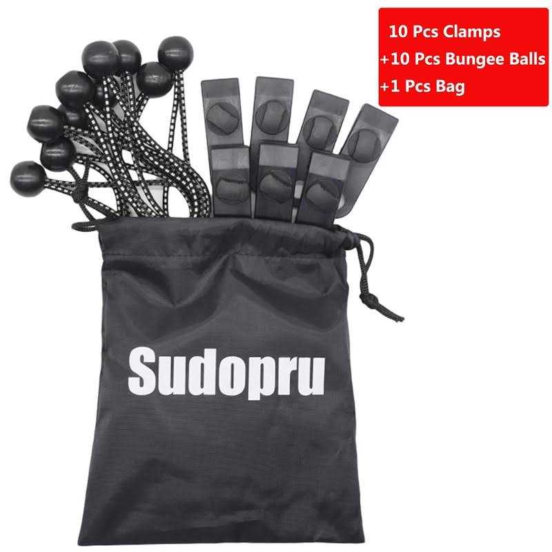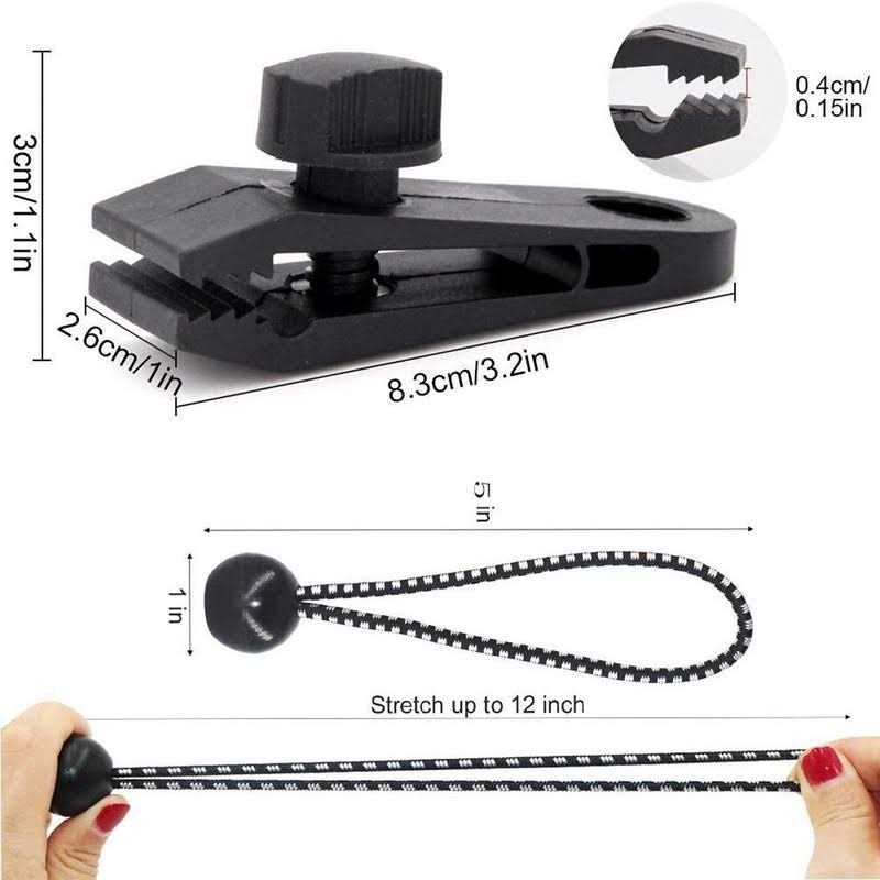 STRONG GRIPPING POWER: Tarp Clips Heavy Duty Lock Grip designed with adjustable spiral thumb screws, alligator mouth with teeth holds tarps much more stable for using tarp clamps, tarp clips EASY TO INSTALL AND REMOVE: Tarp Clips Heavy Duty are easy to install or remove, just tighten or loosen the screw knob to adjust on thick or thin tarps. Package Included: (10 x Tarp Clip + 10 x Bungee Cord) Work as tarp clips, tarp clip, tarp clamps heavy duty, tarp clamps, tarp clamp, tarp bungee with balls, canvas clamps Use for tent clips, tent clamps, tarp tie down clips, tarp holders, tarp holder, tarp fasteners, tarp clips with bungee, car cover clamp