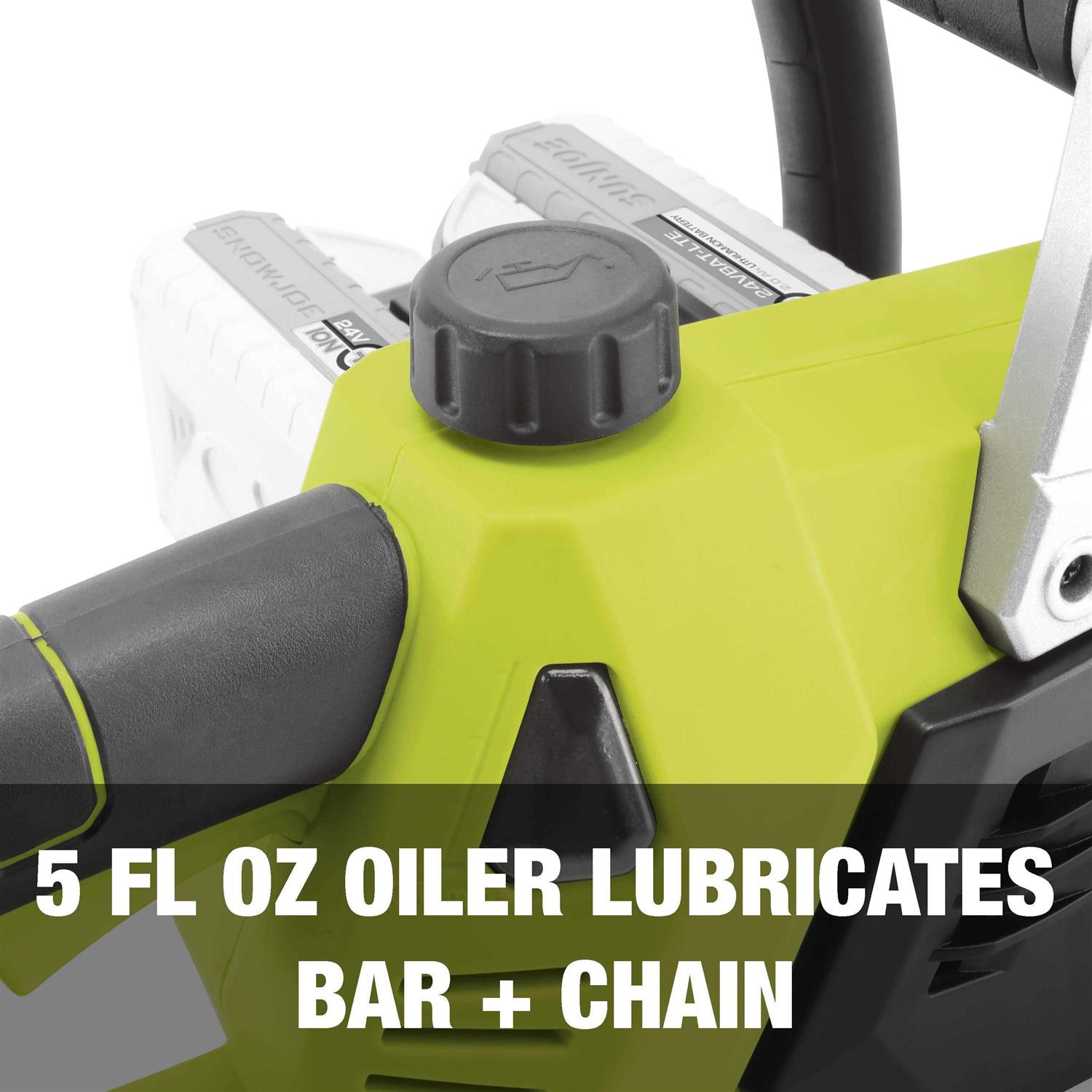 The next generation in tree-trimming tech meets the legendary iONMAX series with this 48V 16 -inch Cordless Chain Saw from Sun Joe. Powered by the 2 included iONMAX 24V 2.0 Ah batteries, this saw has up to 15-minutes of rechargeable runtime and up to 25 cuts per charge. The robust 1,200-Watt motor and self-lubricating 16 -inch bar and chain cut cleanly through branches and logs up to 15.5 thick to quickly clear away brush and branches. The onboard 5 fl. oz. oiler keeps the bar and chain fully lubricated for continuous cutting, and the tool-less chain tensioner provides a quick fix on-the-go with just a twist. Top-notch safety features include a built-in hand guard, kick-back brake, safety switch, and sheath for safe bar storage when the work is done.
