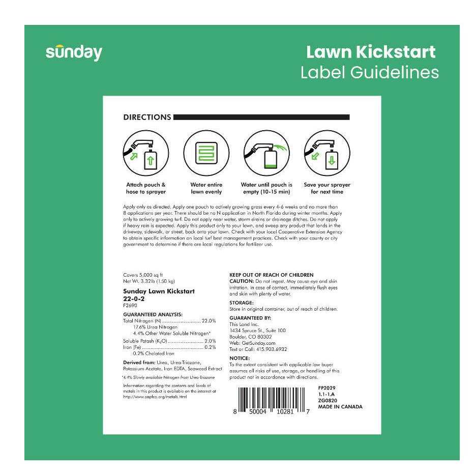 Sunday Texas Green Lawn Fertilizer for Lush Growth (22-0-2) As the first lawn care system powered by local soil and climate data, Sunday knows what Lone Star lawns need to thrive. With potassium for hydration management and slow-release nitrogen for sustained greening in extreme heat, Texas Green liquid lawn fertilizer embraces the power of nature to improve your lawn without unwanted pesticides. Does it work? Yes—by boosting active plant growth and fortifying your soil. Is it easy? Absolutely. With our easy-to-use fertilizer pouch, no spreader is necessary. Just attach to any hose and spray it on! [INGREDIENTS] Slow-release nitrogen Potash [INSTRUCTIONS] With our cutting-edge fertilizers, DIY lawn care is as easy as watering your lawn! Remove the cap and attach the sprayer nozzle. Attach your hose, turn on the water, and open the valve to spray. Spray in even strokes, fully drenching your entire lawn. Save your sprayer nozzle for next time. Apply every 4–6 weeks while grass is growing. Before you spray, be sure that your lawn is sufficiently hydrated. Do not apply to drought-or heat-stressed lawn and be sure to fully drench the blades of grass. Once the fertilizer dries, you can get back out on your grass.