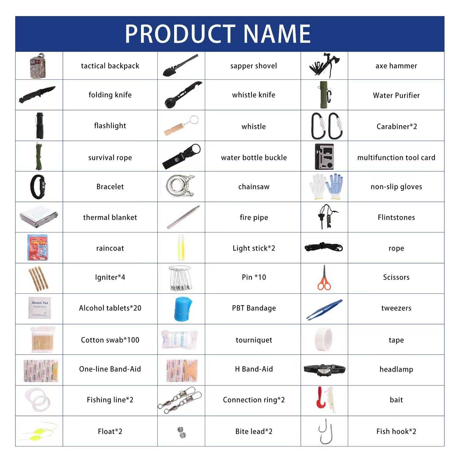 It is professionally designed by survival experts. Survival kits include survival gear, multi-purpose survival kits and fishing kits. It can meet your various needs and facilitate your various outdoor activities such as camping, hiking, mountain climbing, boating. Including various survival accessories: 14-in-1 multi-function axe, folding shovel, tactical flashlight, portable personal water filter, gloves, headlights, multi-functional knife, survival bracelet, double whistle, wire saw, parachute rope, plastic raincoat, fire-fighting tools, fishing tools. Protect you in wilderness or disaster. 8″*6″*6″ 600D nylon camouflage bag. Small and lightweight, easy to carry. Compatible with the Molle system, the sturdy and durable MOLLE shoulder straps can be attached to other bags or any MOLLE compatible gear for your outdoor activities. A better companion for those who love the outdoors. Suitable for various situations, suitable for hiking, camping, fishing, boating, cycling, motorcycles, outdoor adventures, shooting, hunting and other outdoor or indoor activities. Also suitable for hurricanes, floods, survival of natural disasters such as fires and earthquakes. High-quality equipment can provide you with convenience and protection. The gift of choice for men, fathers, family and friends. br br Having an emergency survival kit is an important step to prepare and protect you and your family members for those unforeseen events. It’s very very necessary as you never know when and where an emergency or survival situation will happen. br Our survival kit is your great choice. It is a very convenient and practical professional emergency survival kit, equipped with 218 pieces of emergency survival tools and emergency supplies, which can meet your different needs in emergencies. br Get this professional survival kit for yourself, family or friends, and enjoy a more relaxed and safe travel and adventure. br