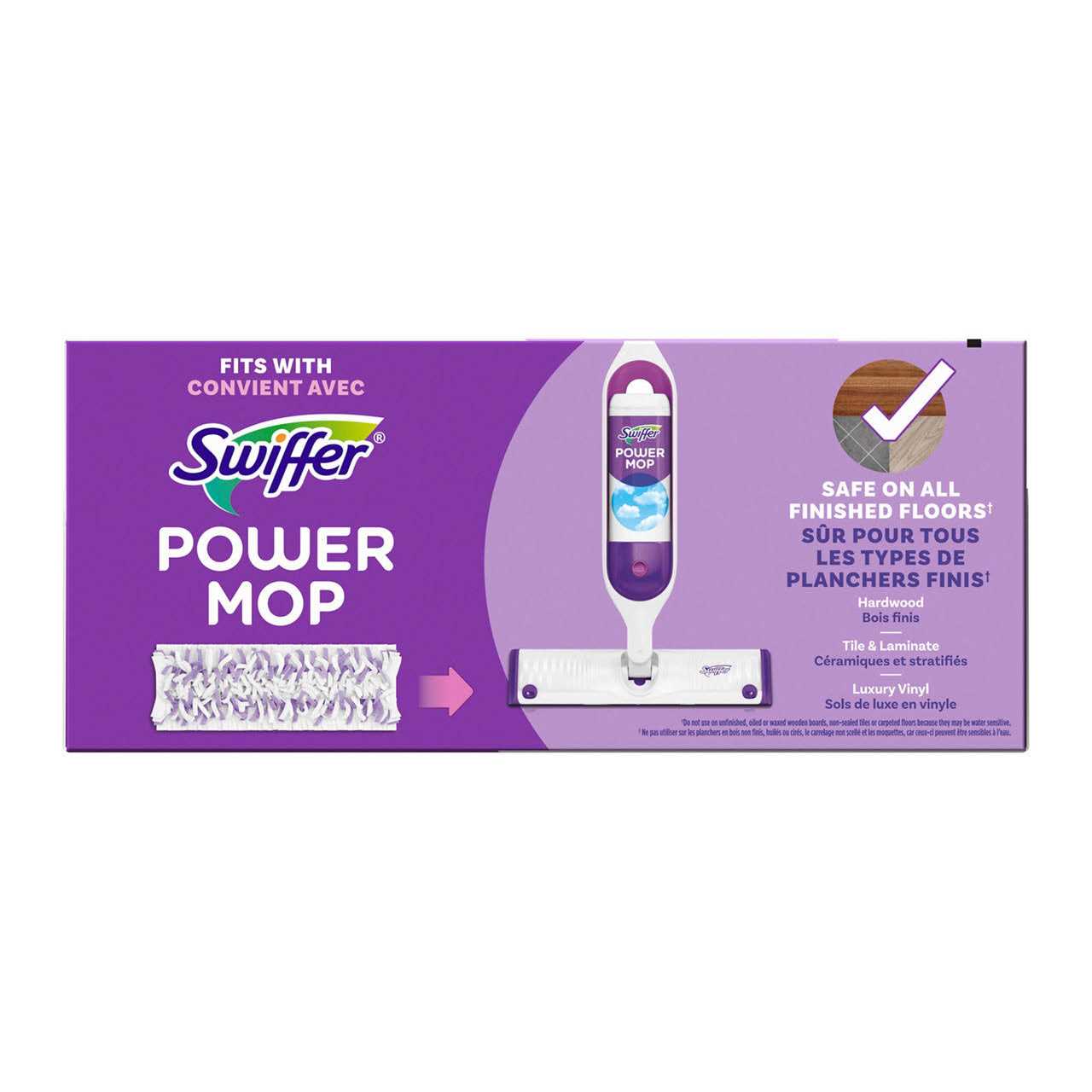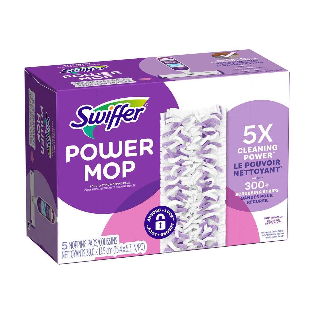 Purple – 5 / BoxSwiffer PowerMop Multi-Surface Mopping Pads refill your Swiffer PowerMop (not included) – an all-in-one mopping system that gives you a mop-and-bucket clean in half the time. Clean your floors from tile to wood in minutes. Multi-surface mopping pads feature more than 300 scrubbing strips that reach deep into grooves and grout to remove sticky spills and daily dirt and grime.