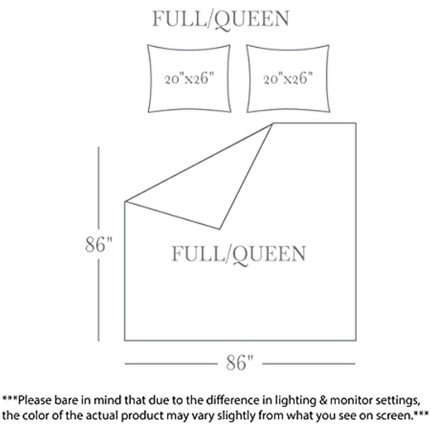 - Full/Queen: 86″ x 86″; standard shams 20″ x 26″